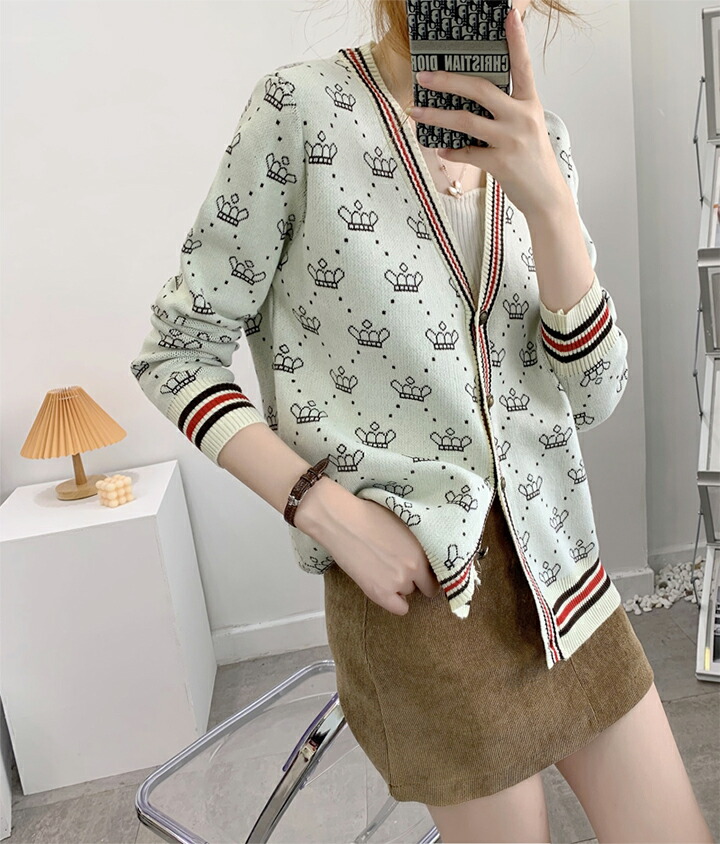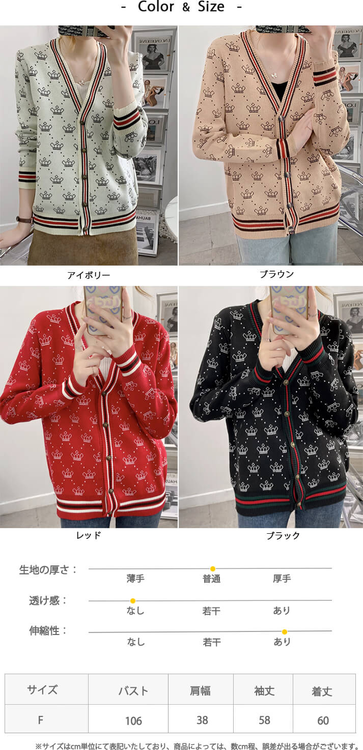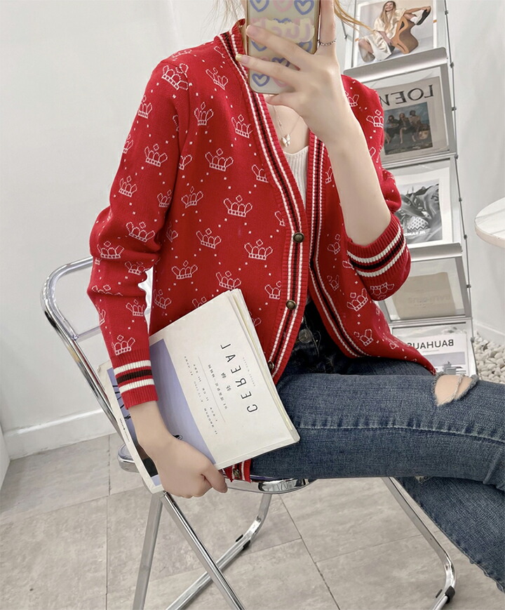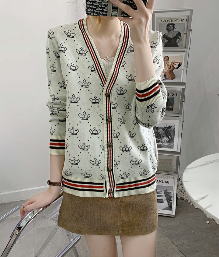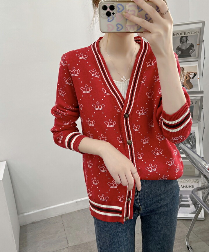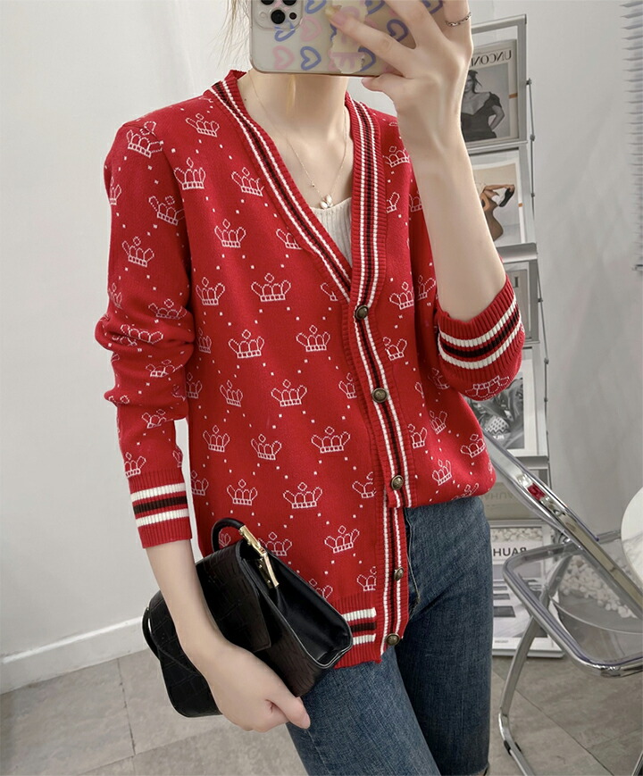 3B25 クラウン柄 ニットカーディガ トップス カーディガン ボレロ 新作 アイボリー ブラウン レッド ブラック