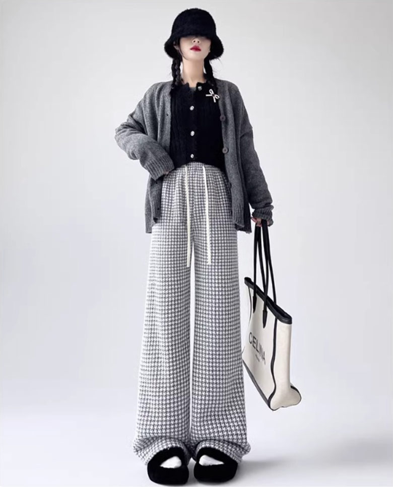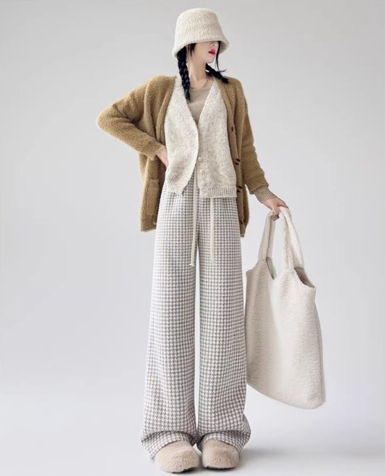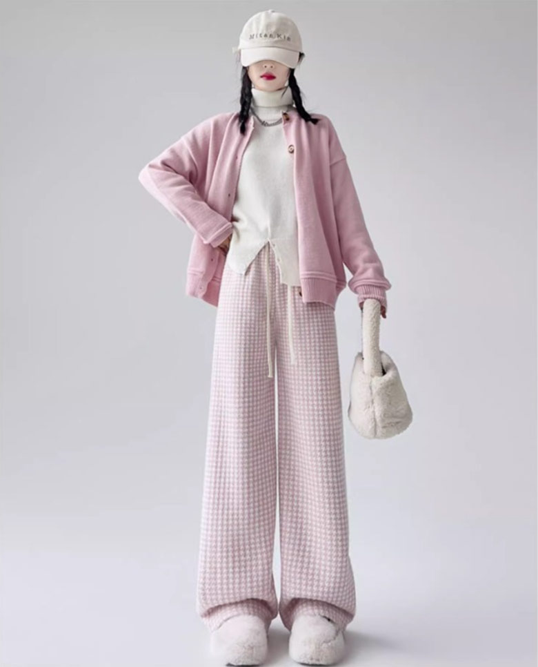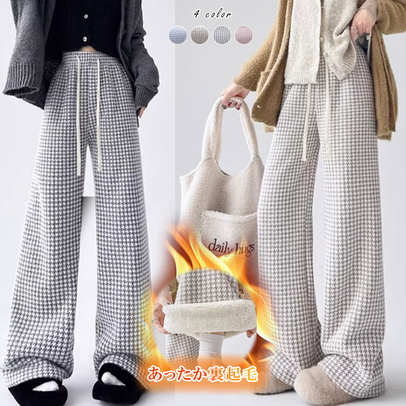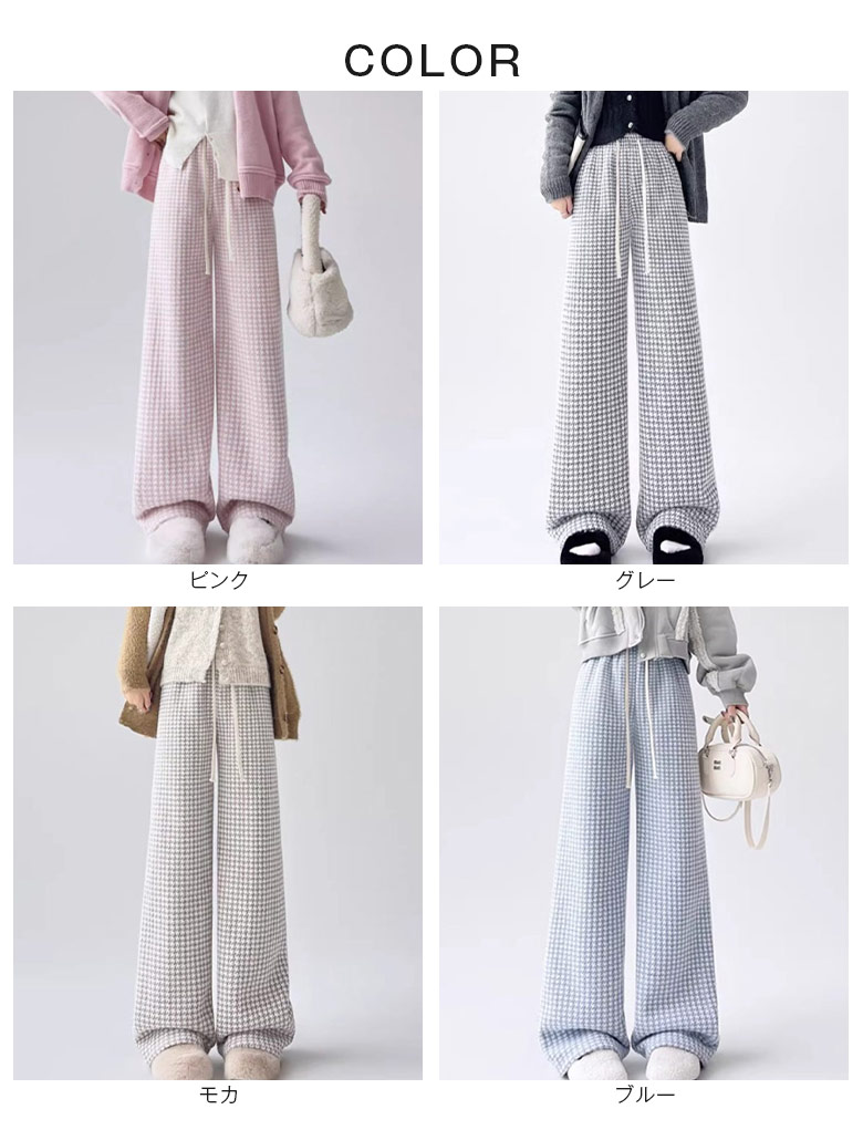 3B-2 千鳥格子柄 ワイドパンツ レ レディースファッション 44%Off ピンク グレー モカ ブルー