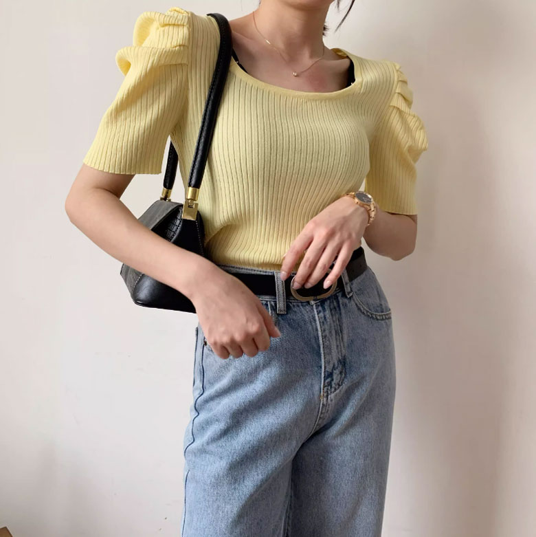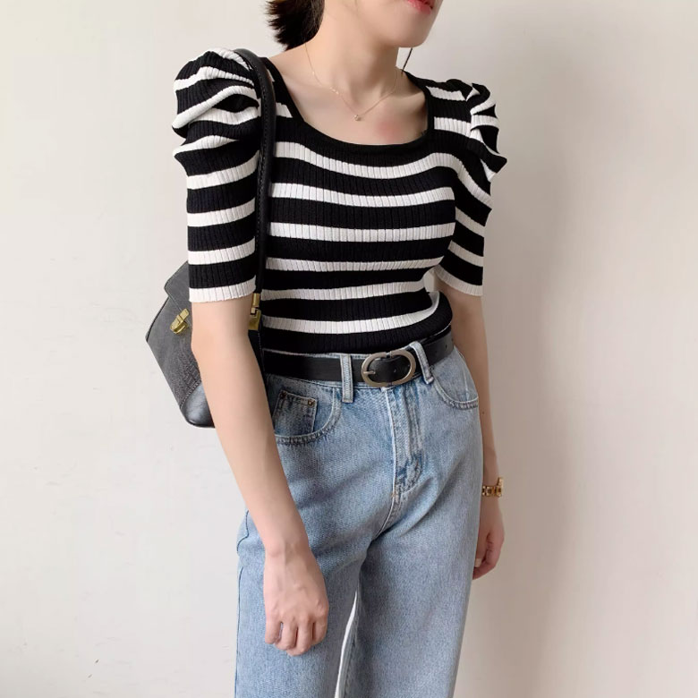 スクエアネック 半袖 ニット レディー レディースファッション お得なセール ボーダー ブラック ホワイト イエロー レッド パープル グリーン