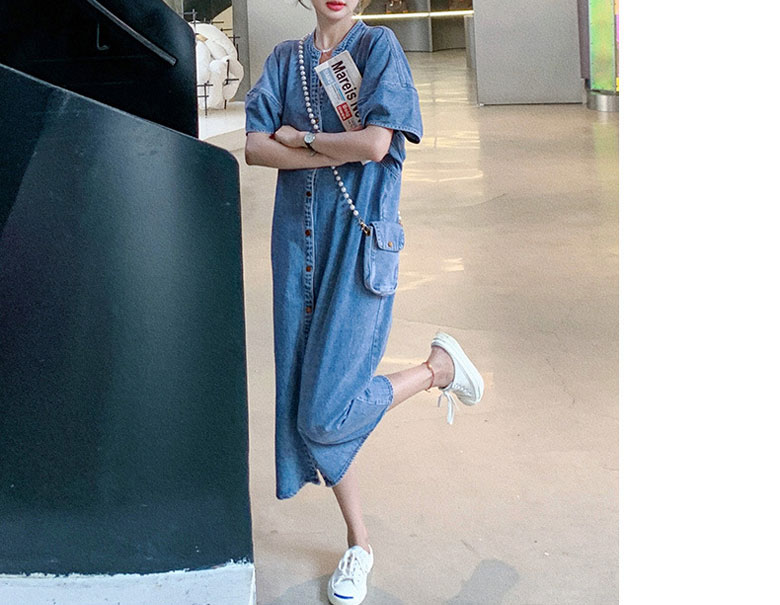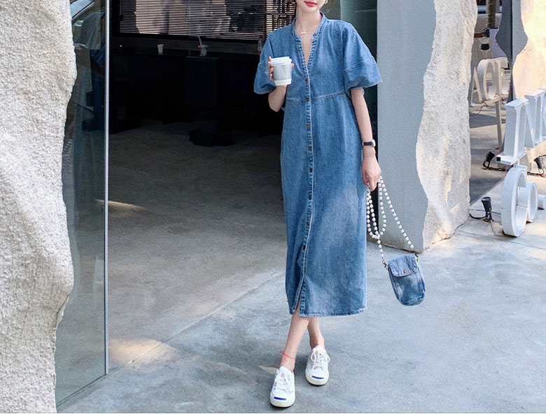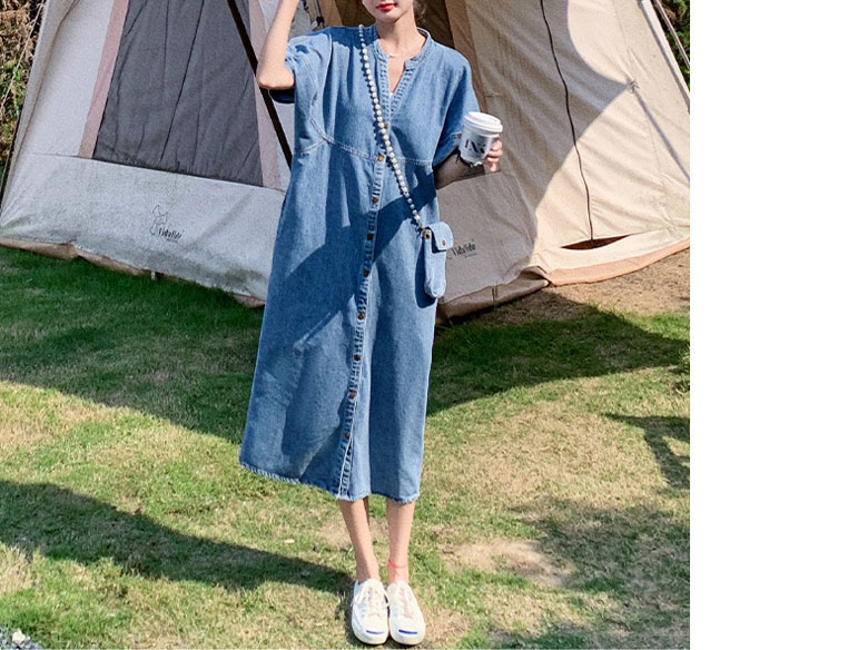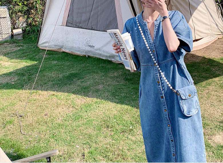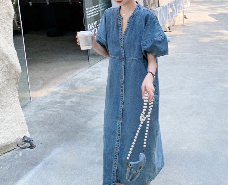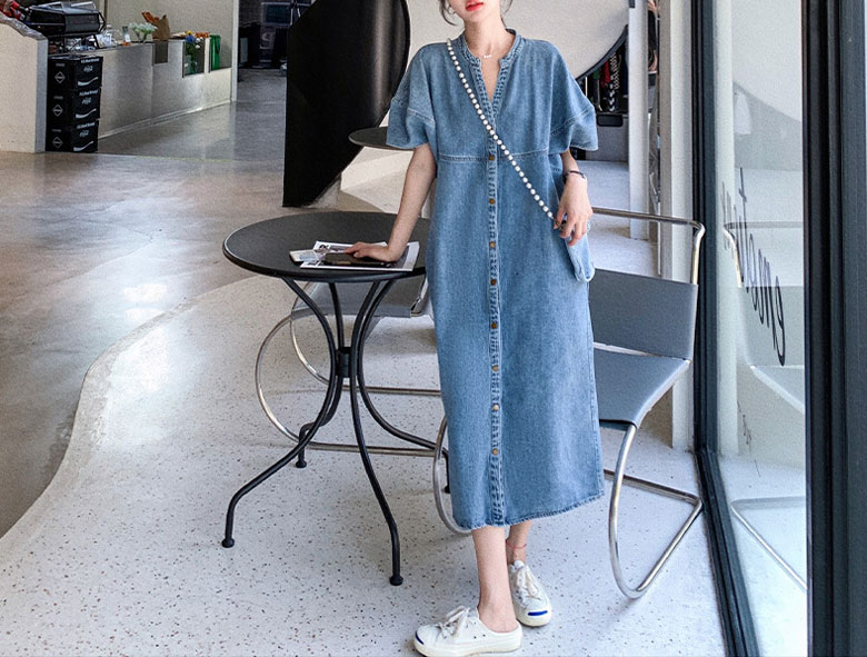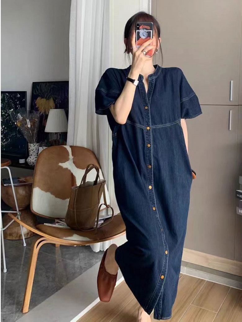 2A42デニム ワンピース ミドル丈 S M L XL ブルー インディゴ