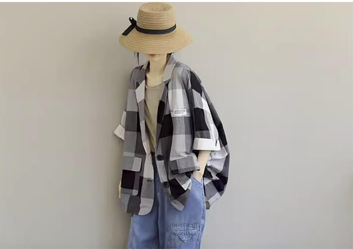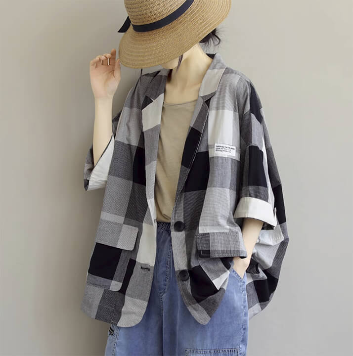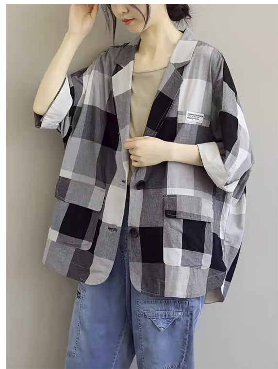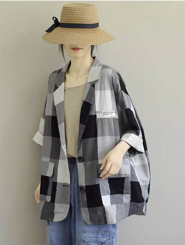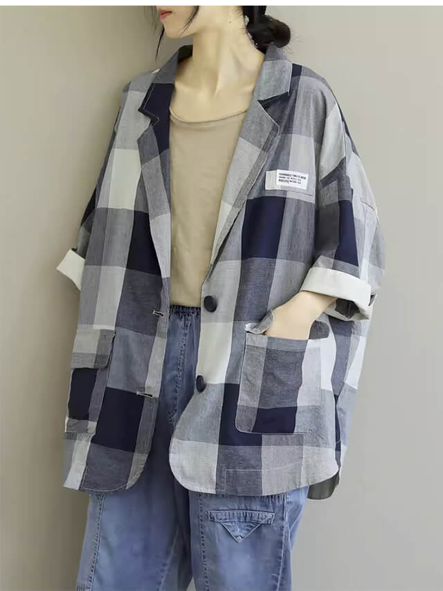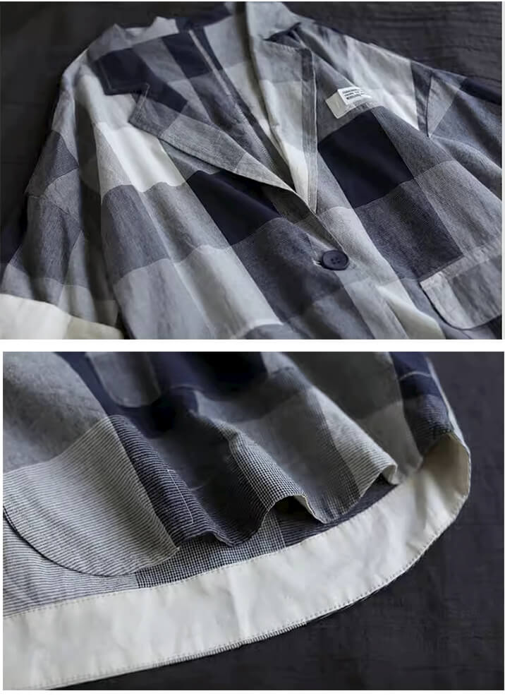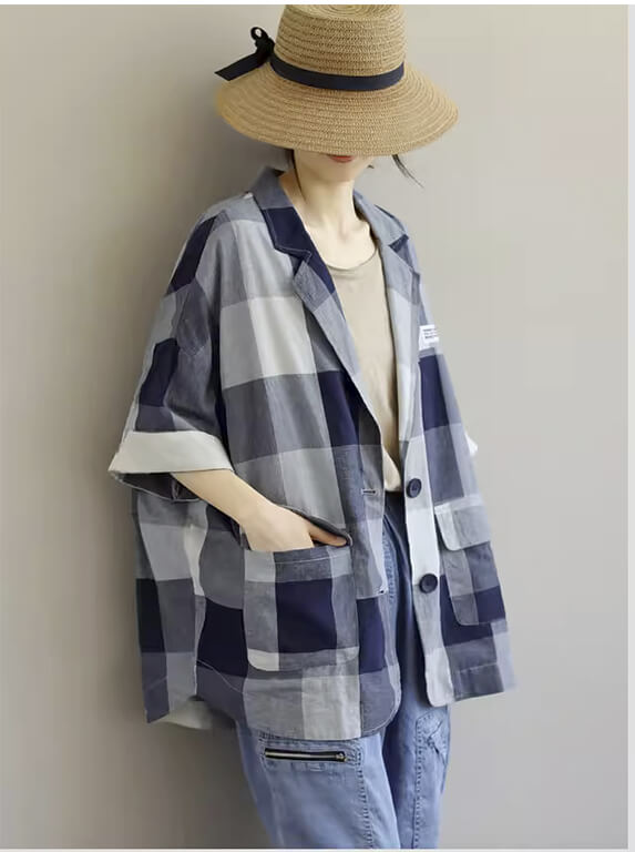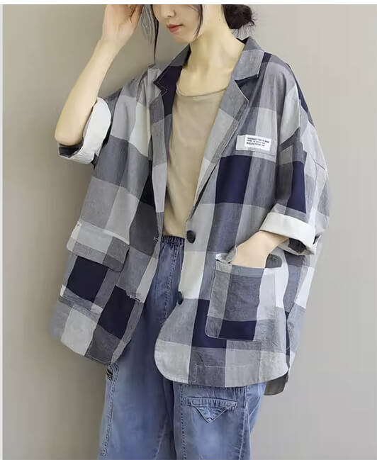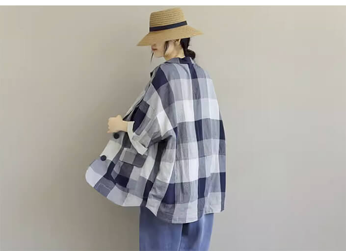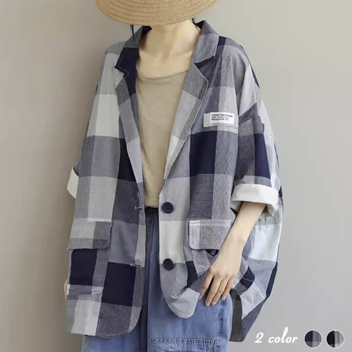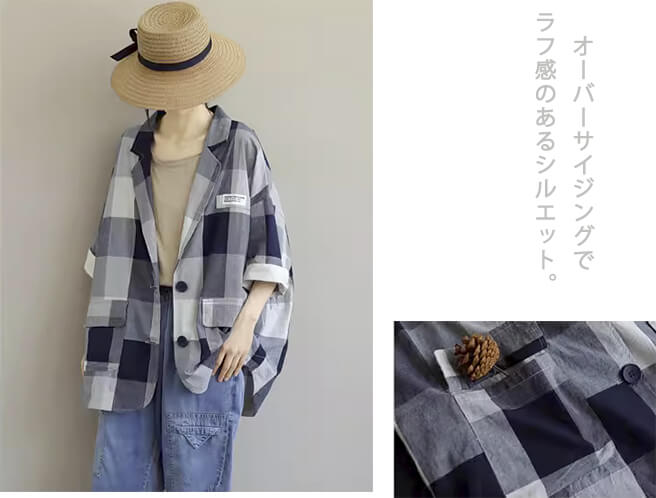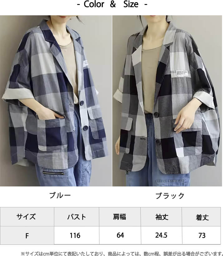 2B30 綿麻 チェックBIGジャケッ レディースファッション 豊富な品揃え ブルー ブラック