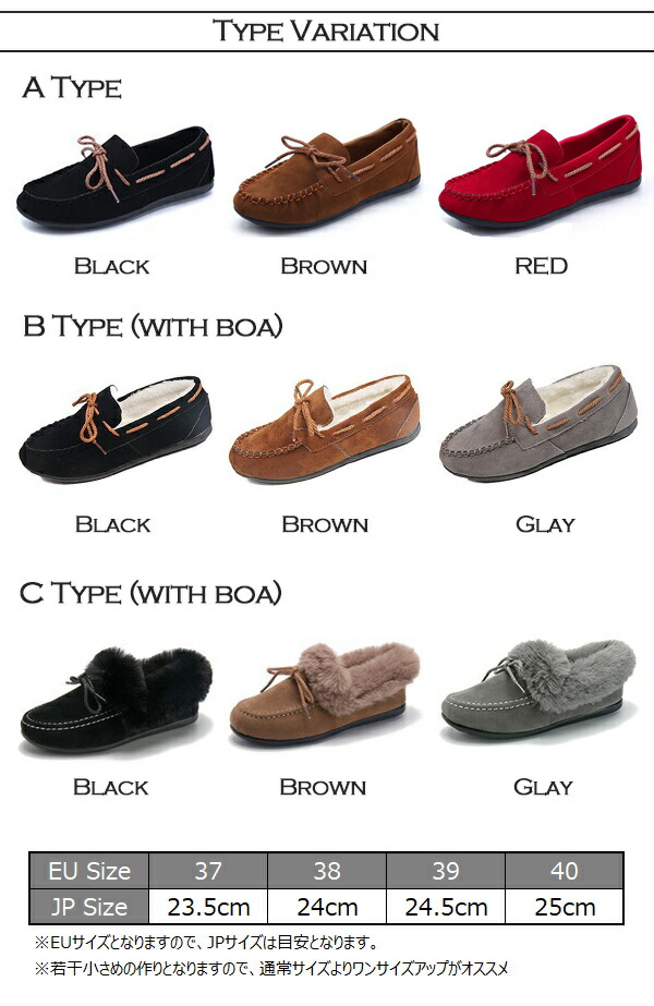 3タイプ モカシンシューズ 暖かファー 靴 38%Off 37 38 39 40 Type A(ボアなし) レッド Type B (ボア付き) ブラック Type B (ボア付き) ブラウン Type B (ボア付き) グレー Type C (ボア付き) ブラック Type C (ボア付き) ブラウン Type C (ボア付き) グレー