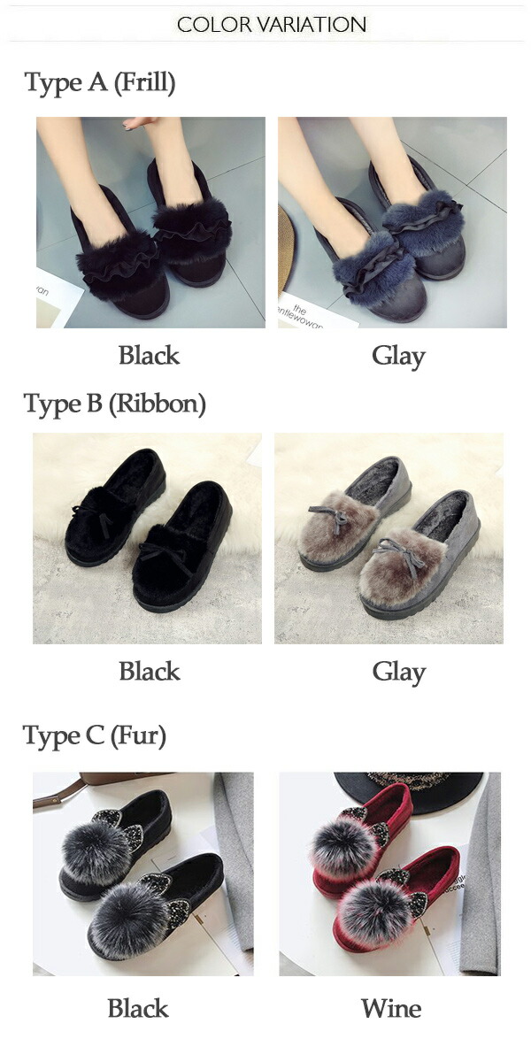 3A31 フラットファーシューズ裏起毛 靴 続々入荷中 37 38 39 40 Type A (フリル) ブラック Type A (フリル) グレー Type B (リボン) ブラック Type B (リボン) グレー Type C (ファー) ブラック Type C (ファー) ワイン Type C (ファー) グレー