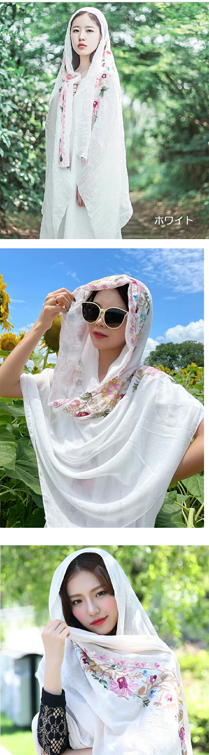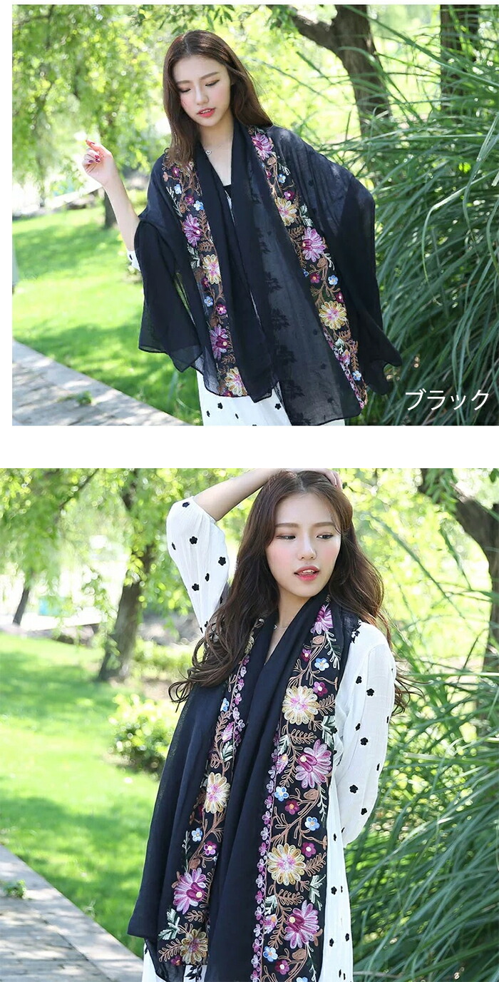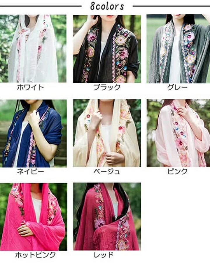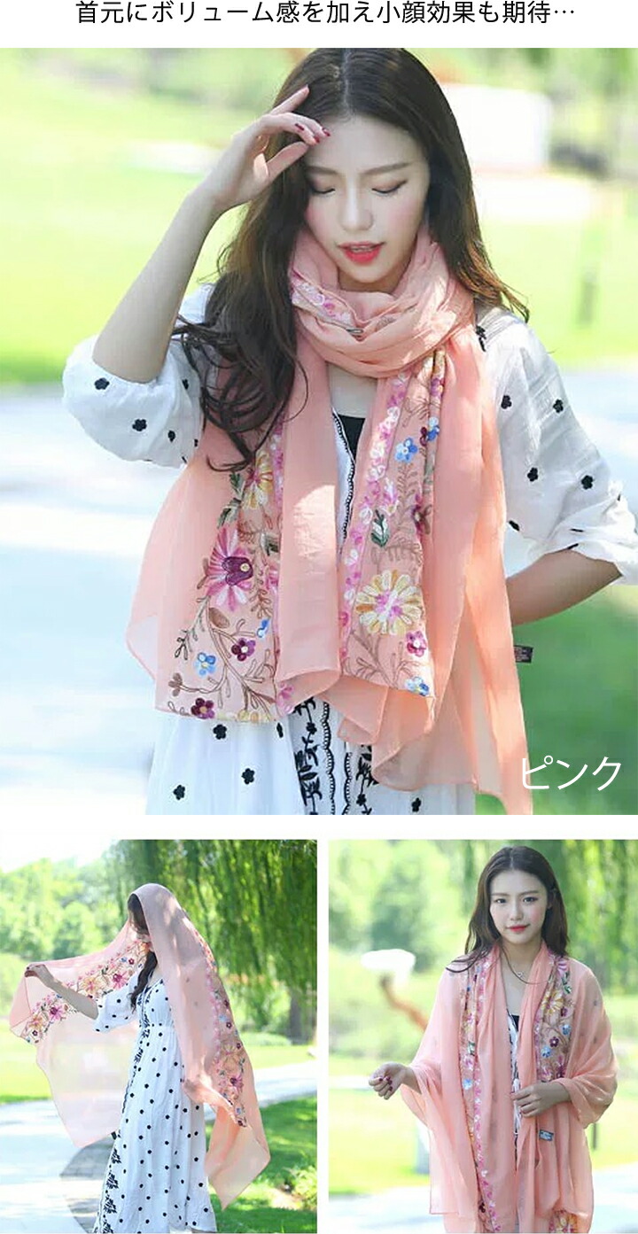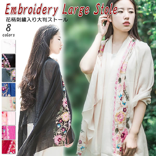 3C 花柄刺繍入り大判ストール マフラ レディースファッション 続々入荷中 ホワイト ブラック グレー ネイビー ベージュ ピンク ホットピンク レッド