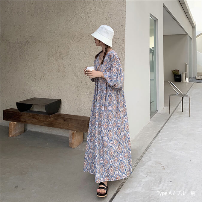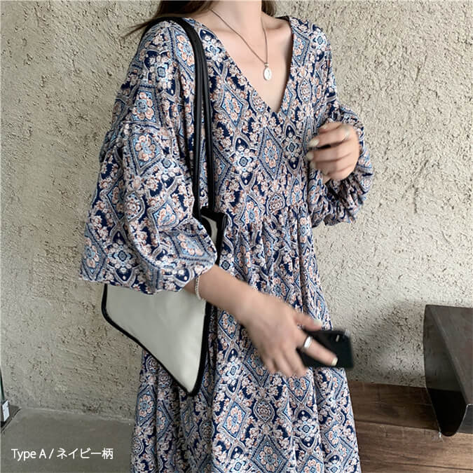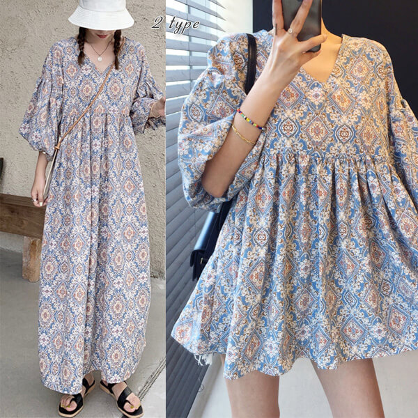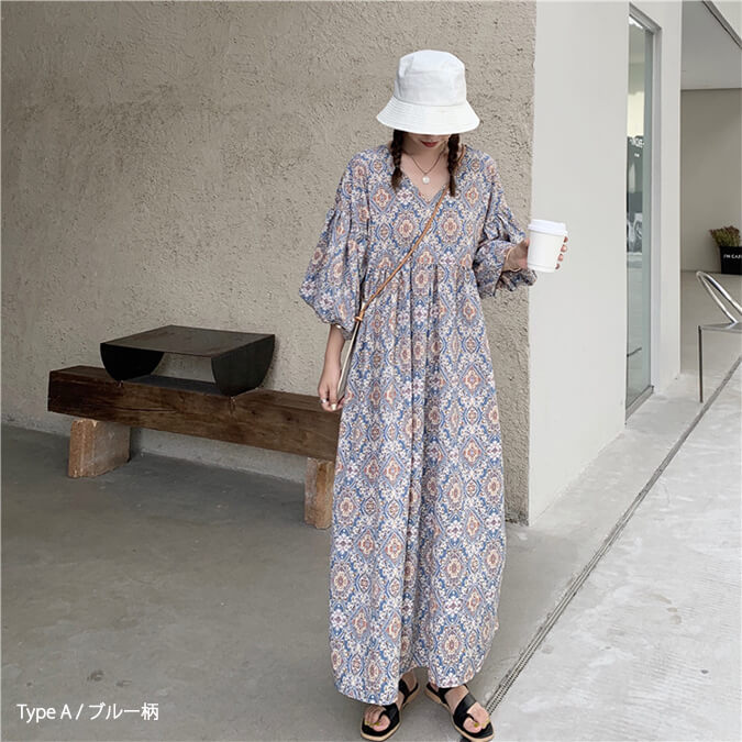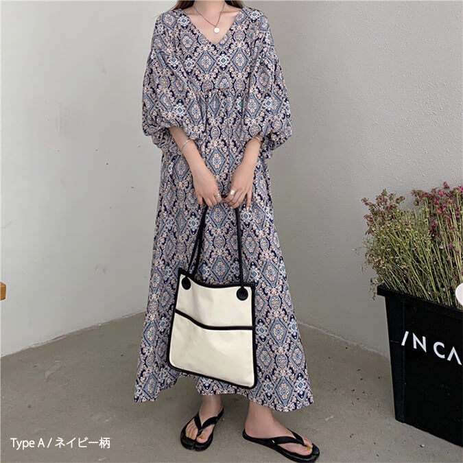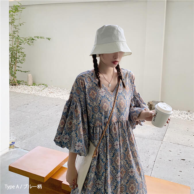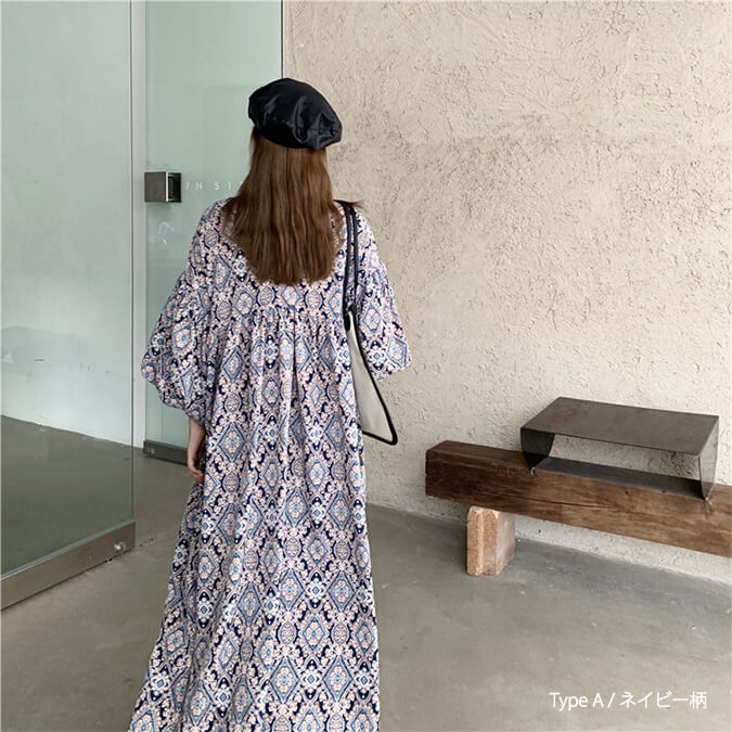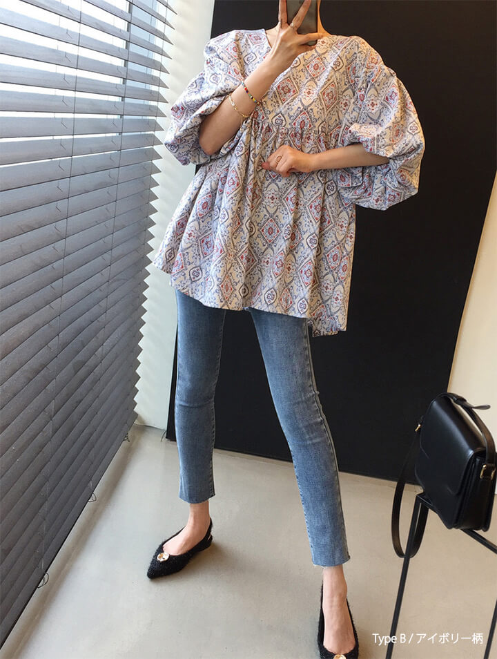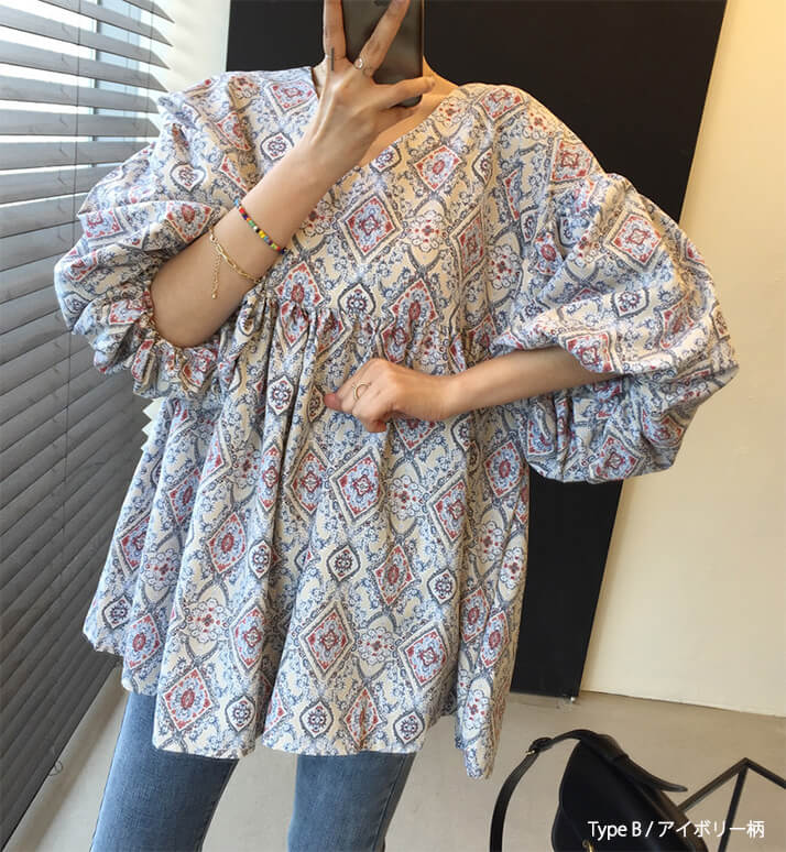 2A49 エスニック柄 パフスリーブ レディースファッション 42%Off TypeA(ブルー柄) TypeA(ネイビー柄) TypeB(ブルー柄) TypeB(アイボリー柄)