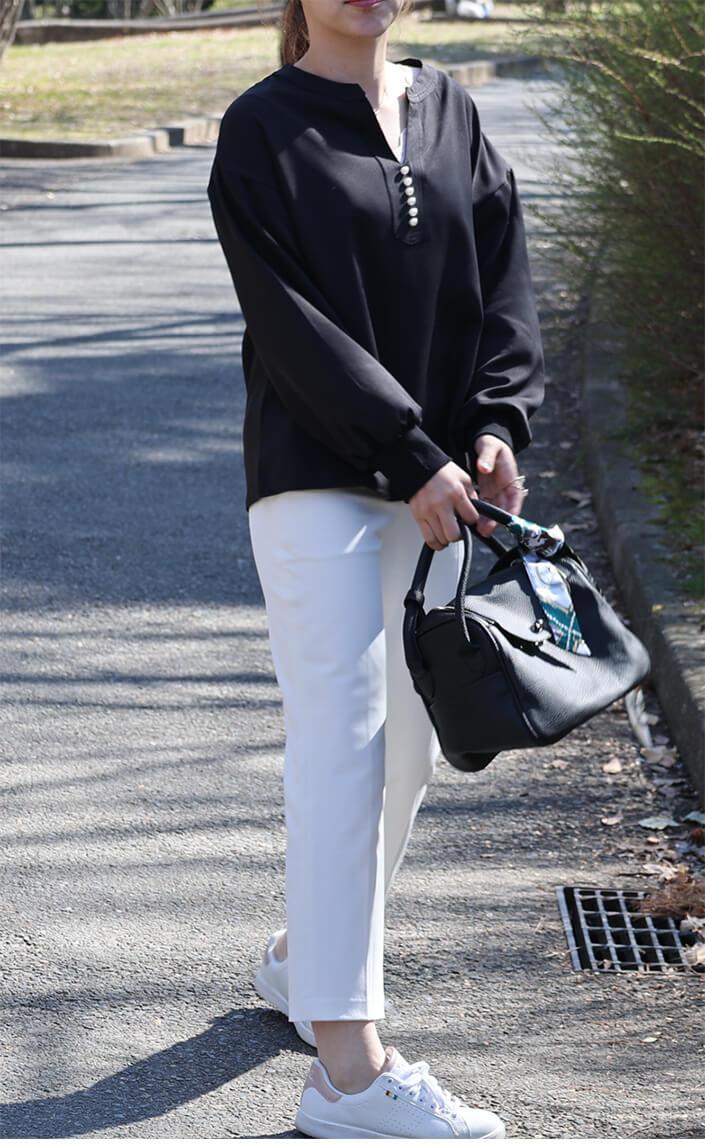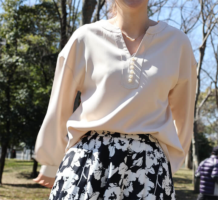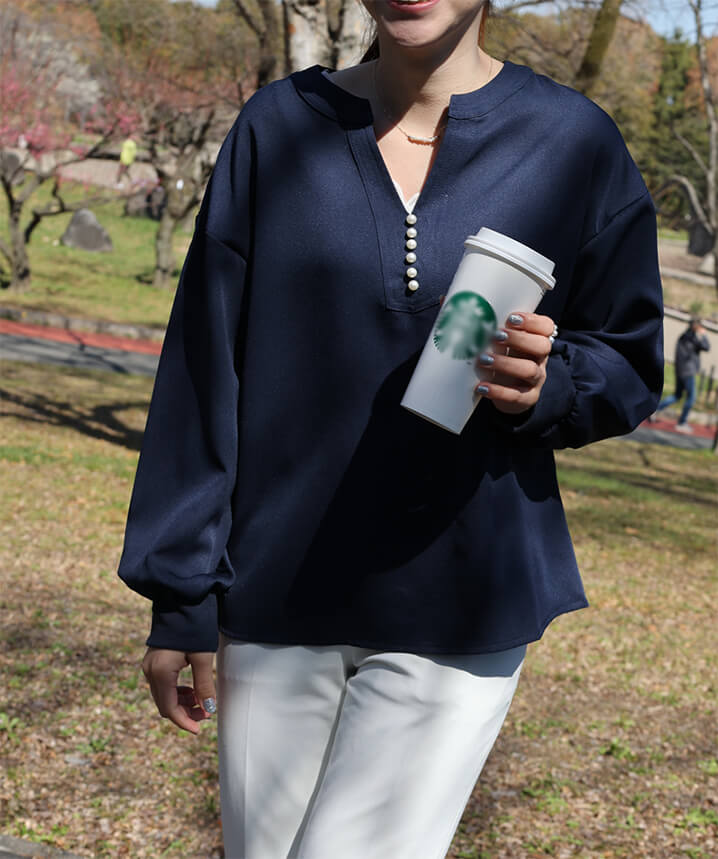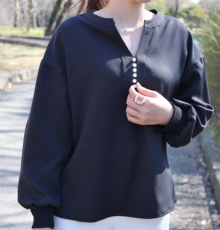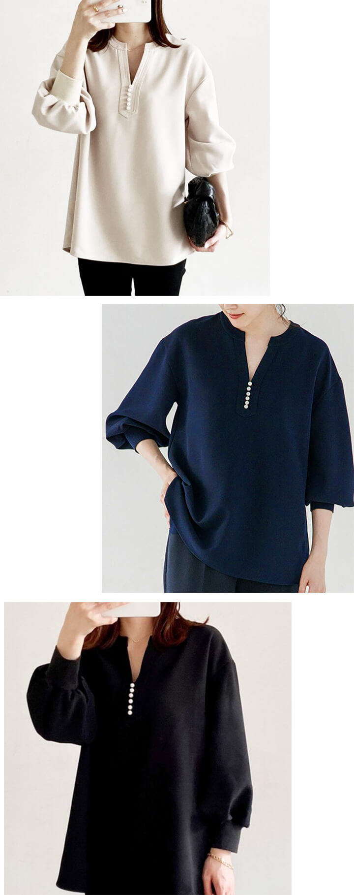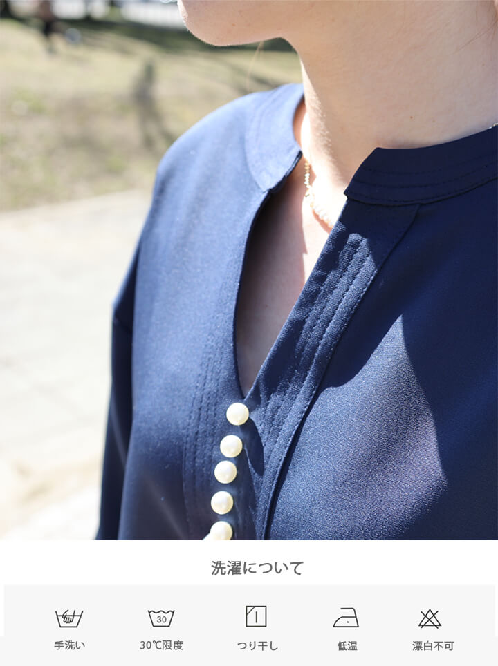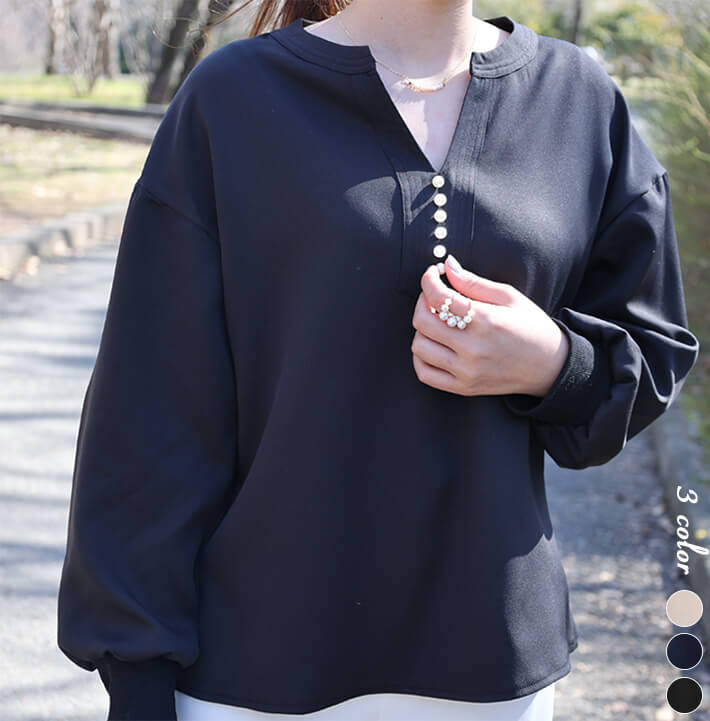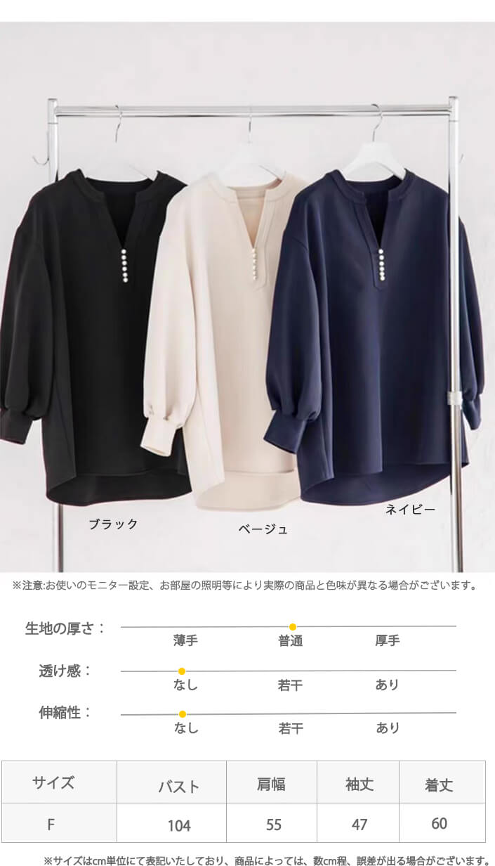 2A46Vネックブラウス パール付きト レディースファッション 割引 ベージュ ネイビー ブラック