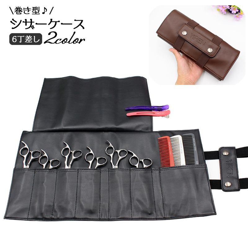 シック おしゃれ 開閉簡単 収納ツール 持ち運び 花屋 理容師 トリマー 美容師 レザー調 6丁挿し 巻き型 シザーバッグ ハサミ収納
