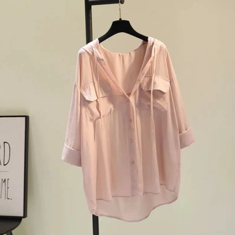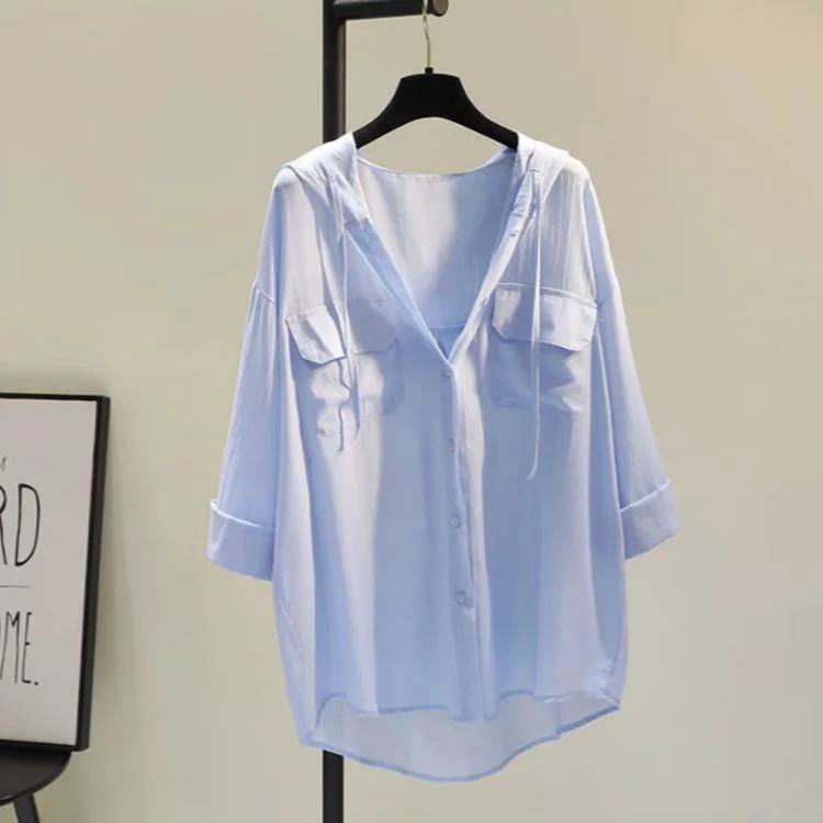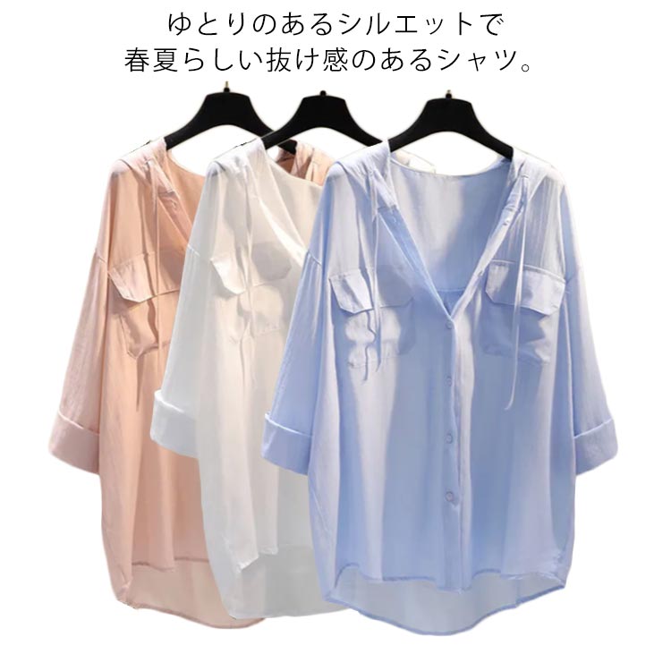 フード付きシャツ ゆったり 綿混 オー レディースファッション 続々登場 ホワイト ブルー ピンク S M L XL 2XL