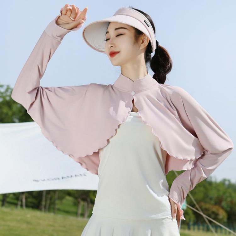 立ち襟 ラッシュガード ケープ 裾フリル パーカー 指穴 UPF50+ 長袖 可愛い UV ゆったり 冷感 着る トップス 体型カバー ボレロ 吸汗 速乾 日焼け防止 スポーツ ゴルフ U 服