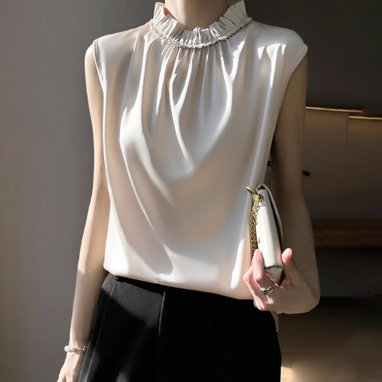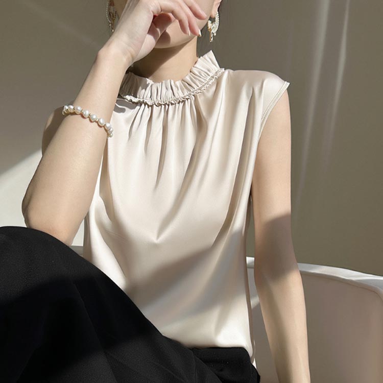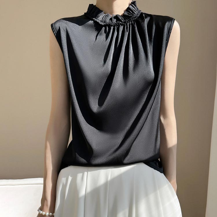 立ち襟 ノースリーブ 光沢感 大きいサ レディースファッション 豊富 ホワイト ブラック シャンパン M L XL 2XL