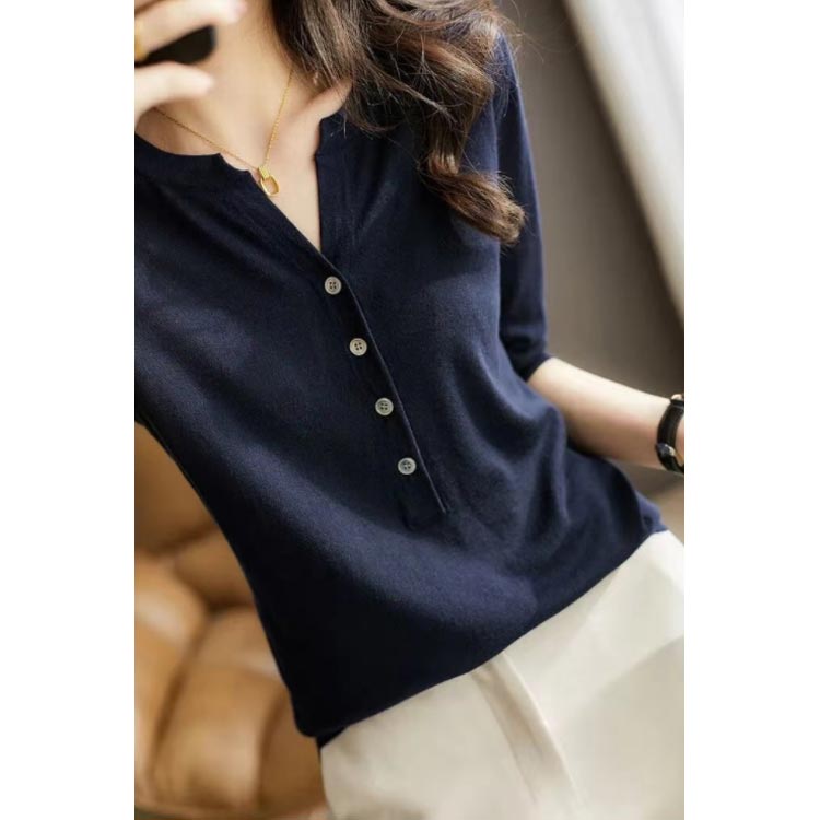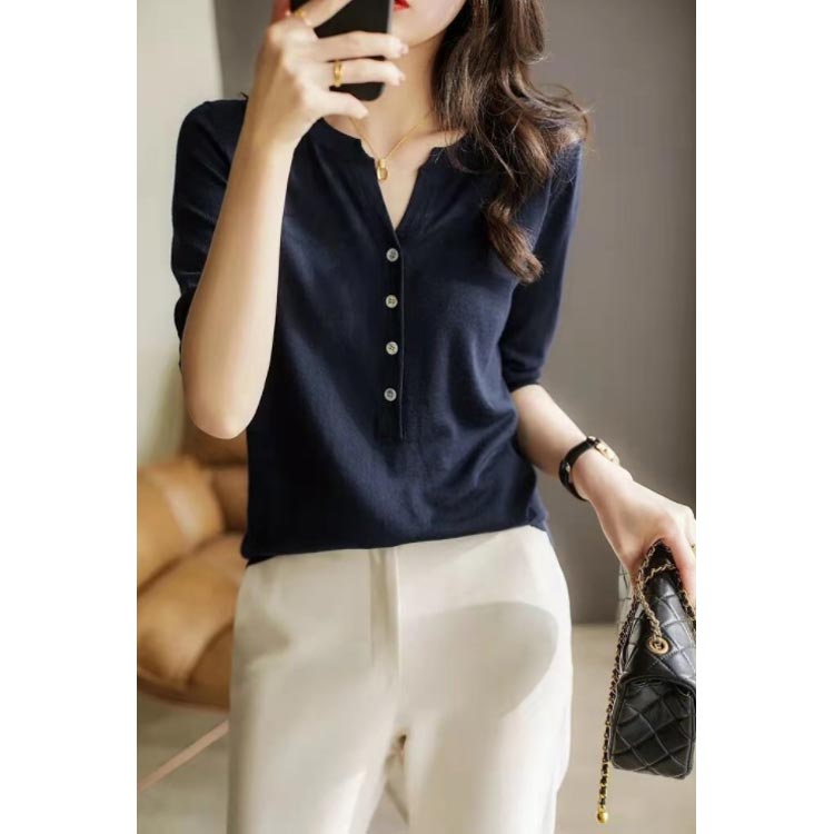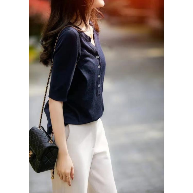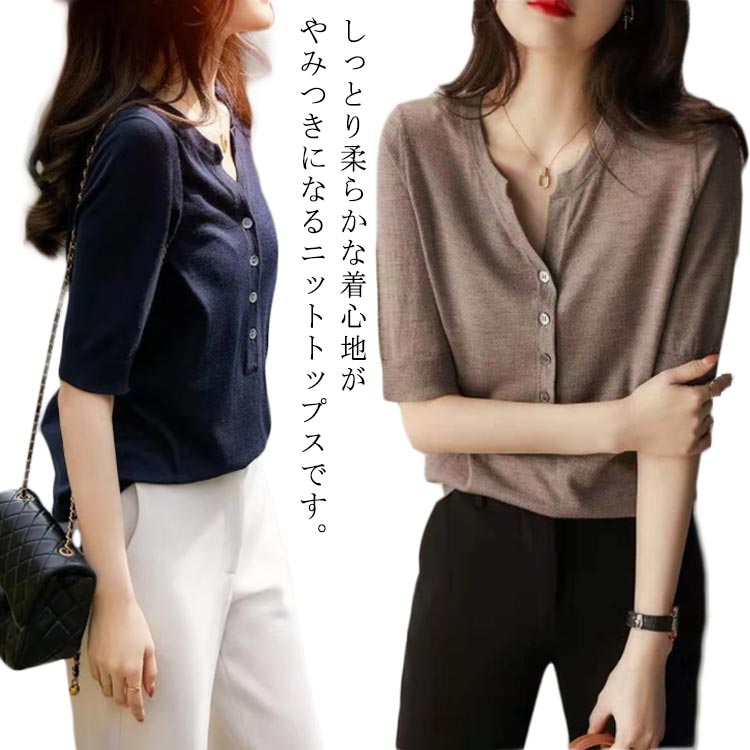 シンプル レディース 五分袖 きれいめ トップス Tシャツ カットソー 人気 ネイビー キャメル