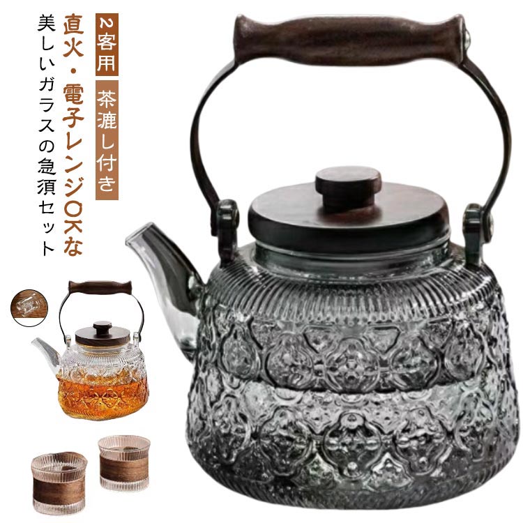 ティーポットフローラガラス 麦茶 1000ml 耐熱 ガラスケトル 直火対応 ガラス急須 2客 ガラス 湯沸かし 手作り セット ガラスポット ガラスティーポット 紅茶ポット おしゃれ 急 大容量