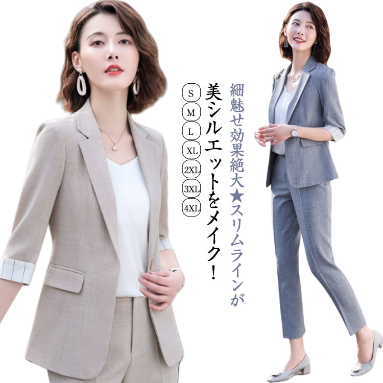 秋 2点セット スーツ パンツスーツ 事務服 セットアップ 通販 グレー ベージュ S M L XL 2XL 3XL 4XL