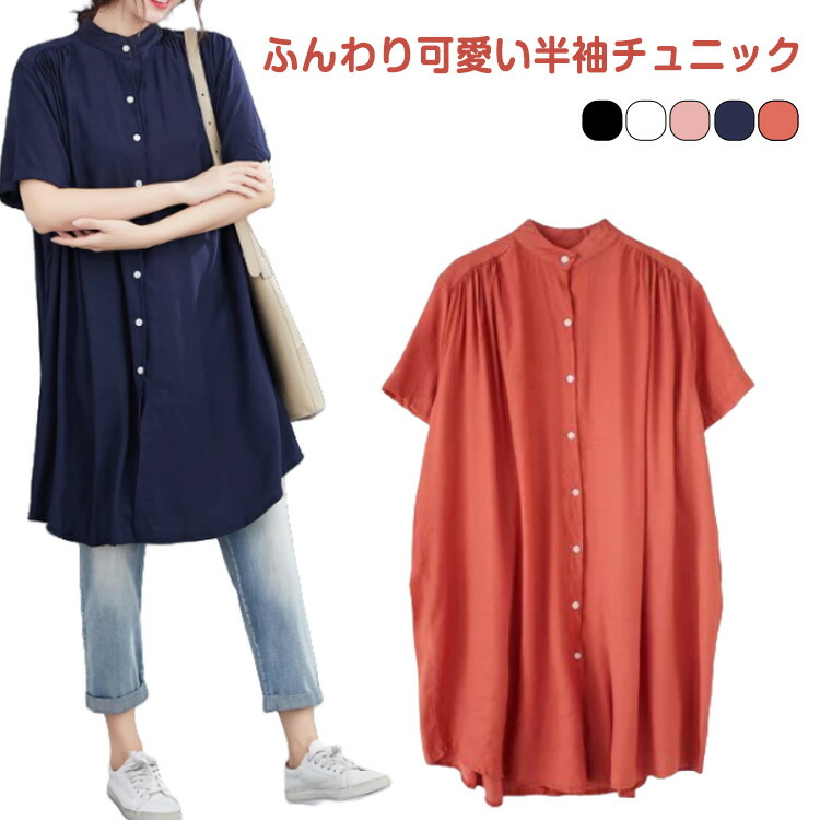 シャツ 白 ドロップショルダー 半袖 チュニック 新作 ホワイト ブラック オレンジ ピンク ネイビー