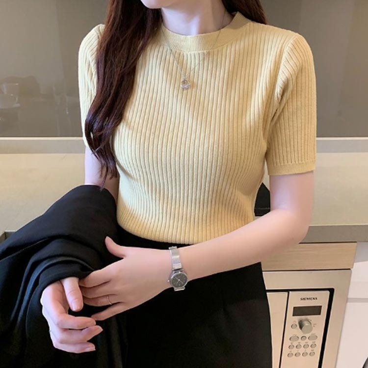 リブニット きれいめ サマーセーター トップス Tシャツ カットソー 通販 パープル ローズピンク グリーン ピンク イエロー オレンジ ホワイト ブラック 杏色 S M L XL