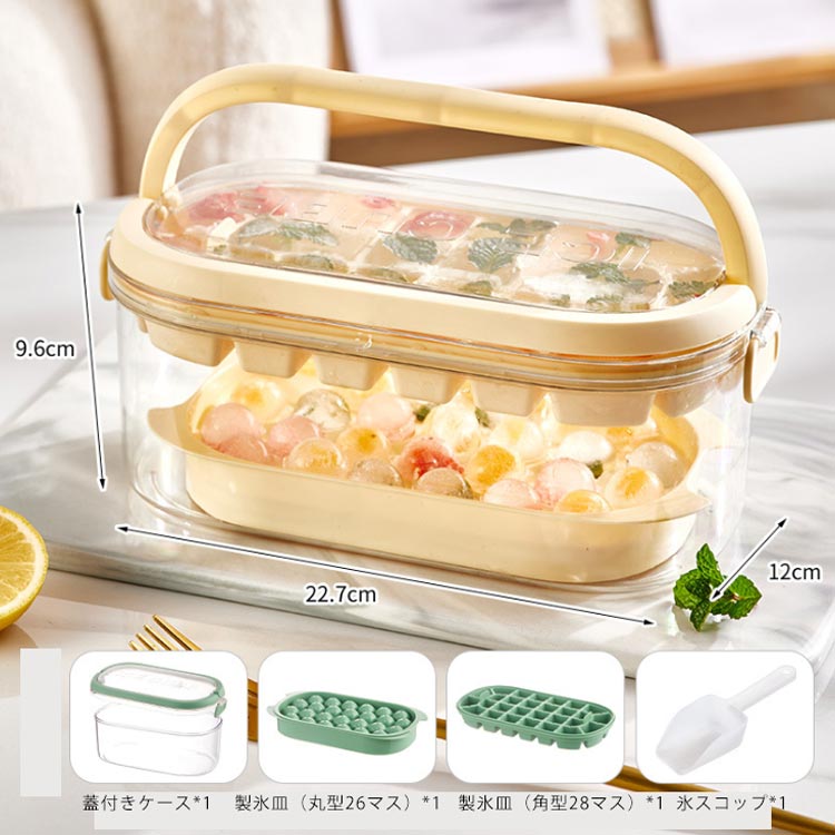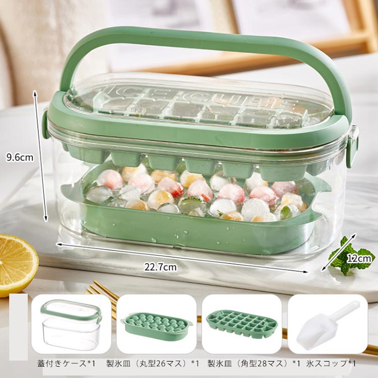 セット内容:蓋付きケース*1、製氷皿(丸型26マス)*1、製氷皿(角型28マス)*1、スコップ*1※商品のサイズは手作業で測定させて頂いておりますので、若干の誤差があります。