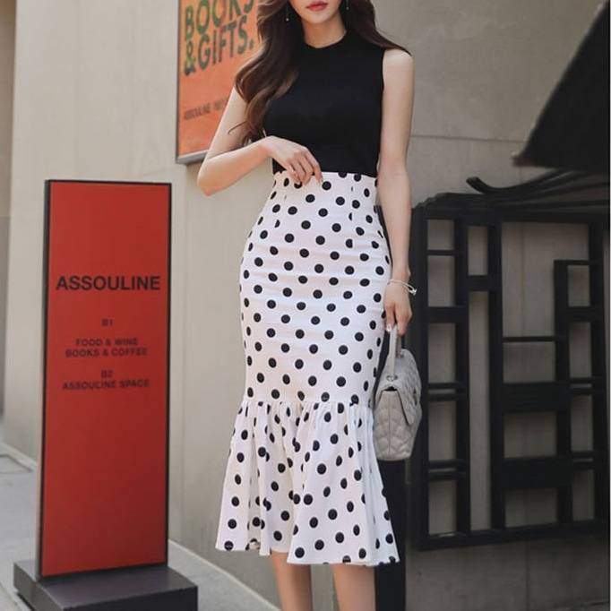 スカート レディース マーメイド ミモレ丈 春 夏 ドット柄 水玉 ブラック ホワイト 2色展開 フレア タイト ハイウエスト 休日 お出かけ デート コーデ 女子会 普段使