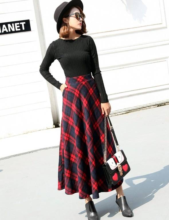 秋冬にぴったりな暖かみあるチェック柄のフレアロングスカート。