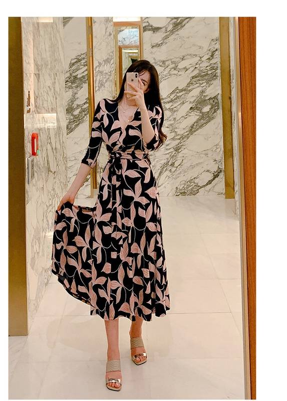 ロング ワンピース 七分袖 レディース 春 秋 ボタニカル Vネック Aライン フレア ウエストリボン ハイウエスト イベント 休日 お出かけ デート コーデ 普段使い 女子