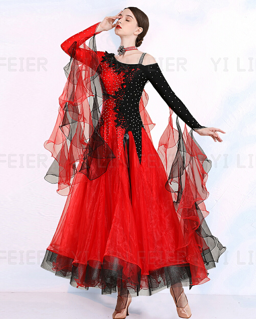 ★女性ワルツダンスドレス大きい裾ワルツに向きセクシーな踊りドレス ダンスドレス 舞踏 踊り ドレス 発表会用ドレス ワンピース 舞台服 社交ダンスドレス