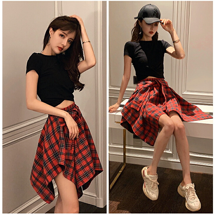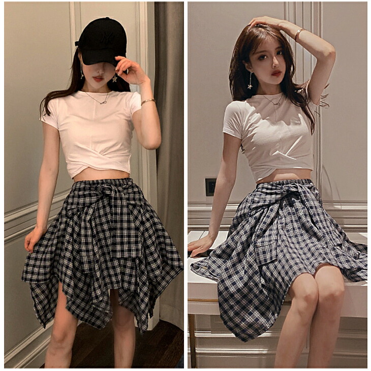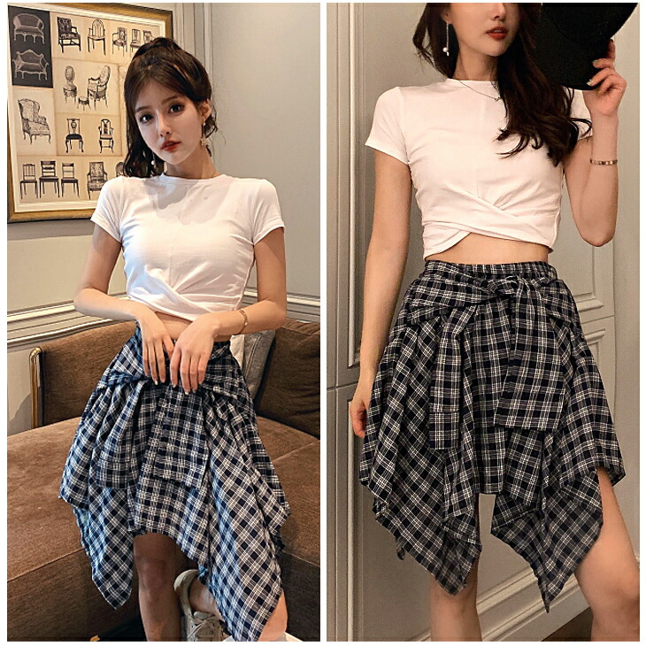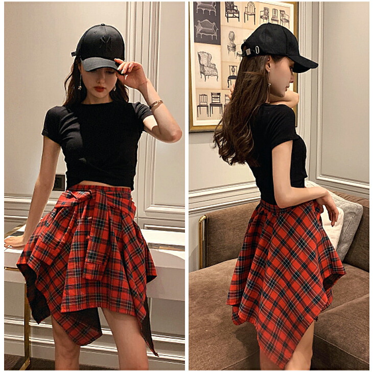 ダンス 衣装 可愛い 不規則 巻きスカート風ミニスカートが新登場☆&クロスデザインへそ出しトップス レディース ダンス へそ出し クロップド丈 半袖 クロス リボン チェック