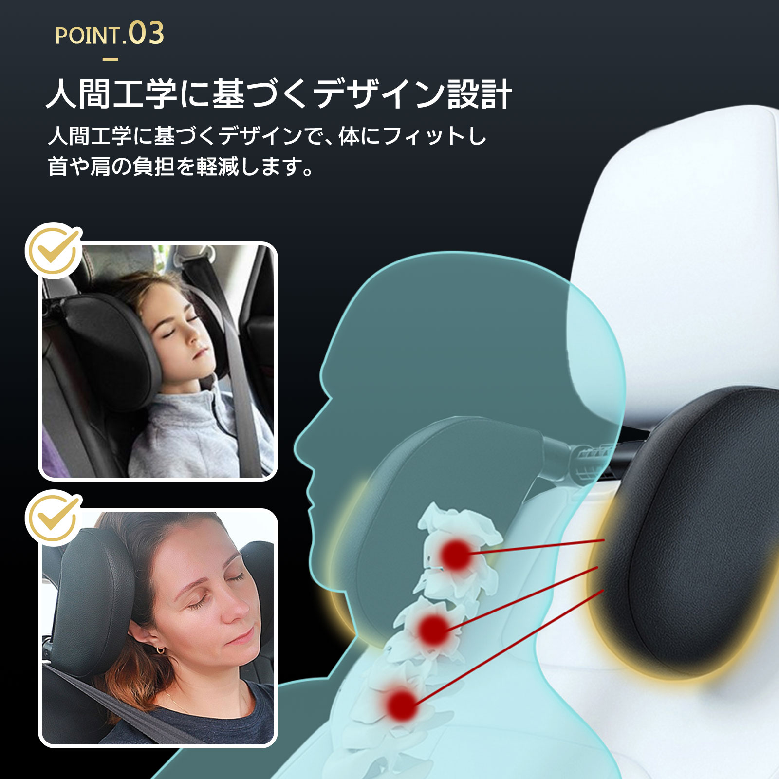 【同乗者に心地よい睡眠を】 車でいつも眠ってしまうお子様、ついつい心地よくで寝てしまうパートナー、交代しながらの長距離運転中に仮眠をとる同乗者など、車で眠る方は以外と多いもの。でも、車で寝てしまうと、起きた時に 首 や肩に違和感を感じませんか そんな方におすすめしたいのが、「車での睡眠に極上のホスピタリティを」というテーマに基づいて企画したALEBANA車用 ヘッドレスト クッション 。車での睡眠の頭の揺れを防ぎ、心地よい眠りを提供します。※ご注意:運転中でのご使用は、眠気を誘発する恐れがあるのでお控えください。