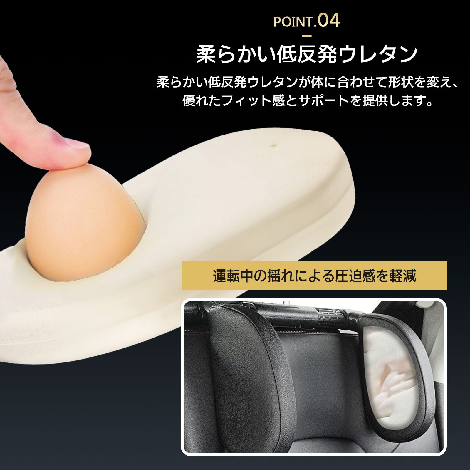 【レザーなのに柔らかい ネックパッド】 ネックパッド 部分は、柔らかい低反発ウレタンの上にソフトな肌触りのPUレザーをカバーに使用しています。レザーシートにもよく馴染みスタイリッシュさと快適さを両立できます。また、カバーは拭き取りやすい素材のため、お子さまが汚してしまっても大丈夫。いつも清潔にお使いいただける 車 枕 カー用品 です。 rav4 や ハイエース 、 アルファード などの人気車種でもご利用可能な アクセサリー としてぜひお役立てください。