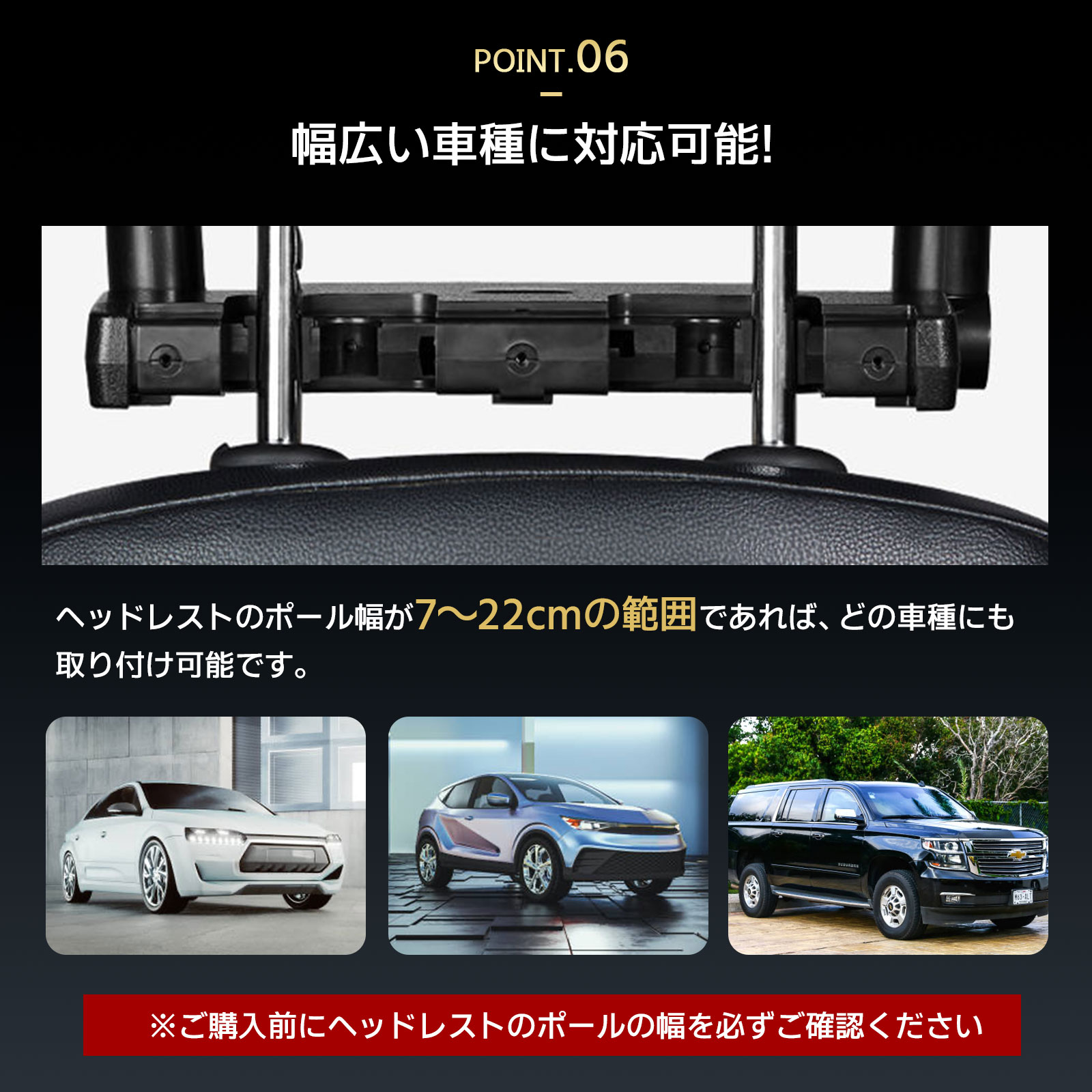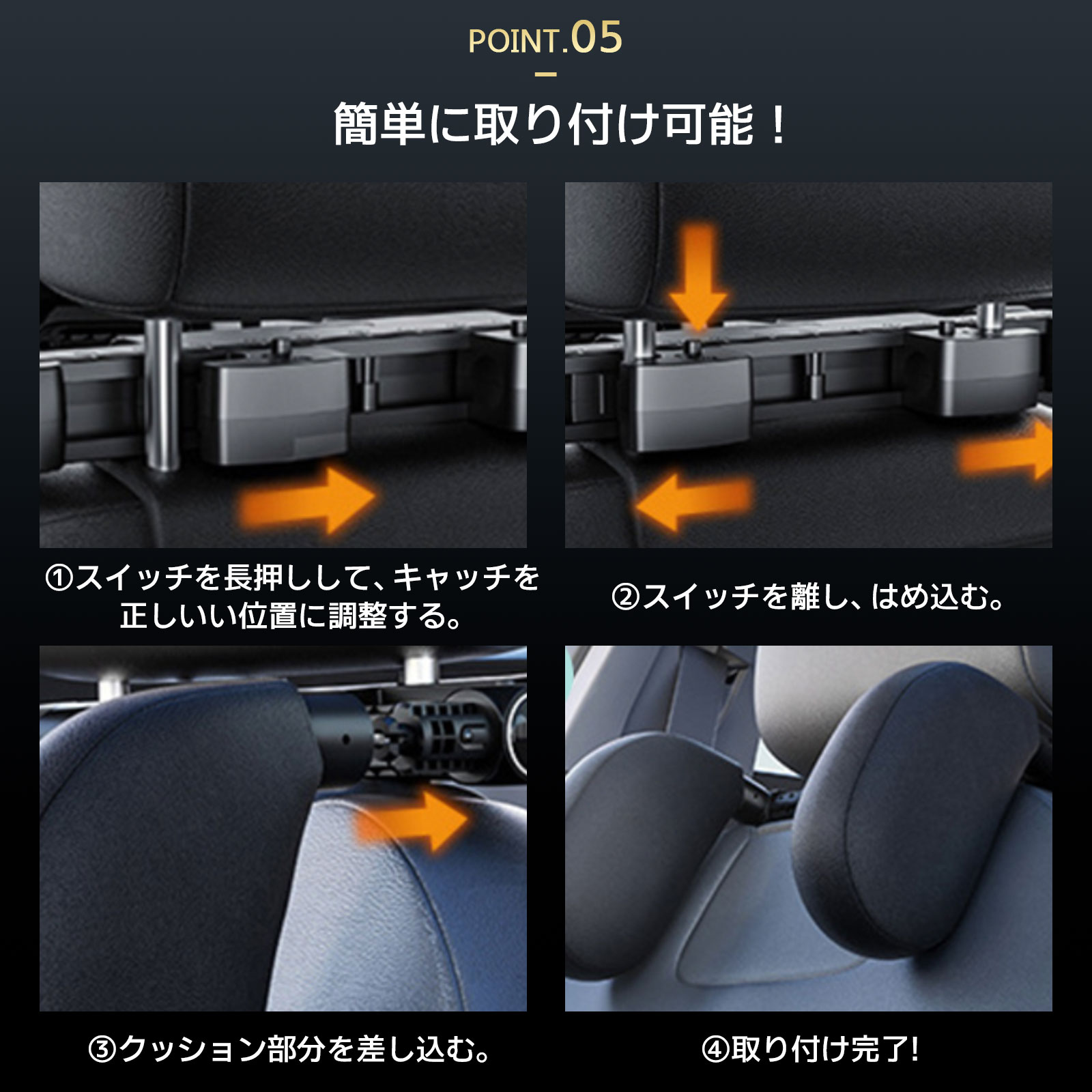 【対応可能車種】 ヘッドレスト ステー(ヘッドレストの支柱)のついている車種(ステー幅は9~21cmまで対応可能)。○工具不要:ボタンを押しながらフックを引っ掛けるだけで設置できます。工具不要で簡単設置。<設置方法>1. 車内 のヘッドレストステーにフィットするアタッチメントを選び、本体スライドバーに取付けます。2.本体背面のフックをスライドし、ステーに装着します。3. ネックパッド を本体の両サイドのバーに差し込み完成です。