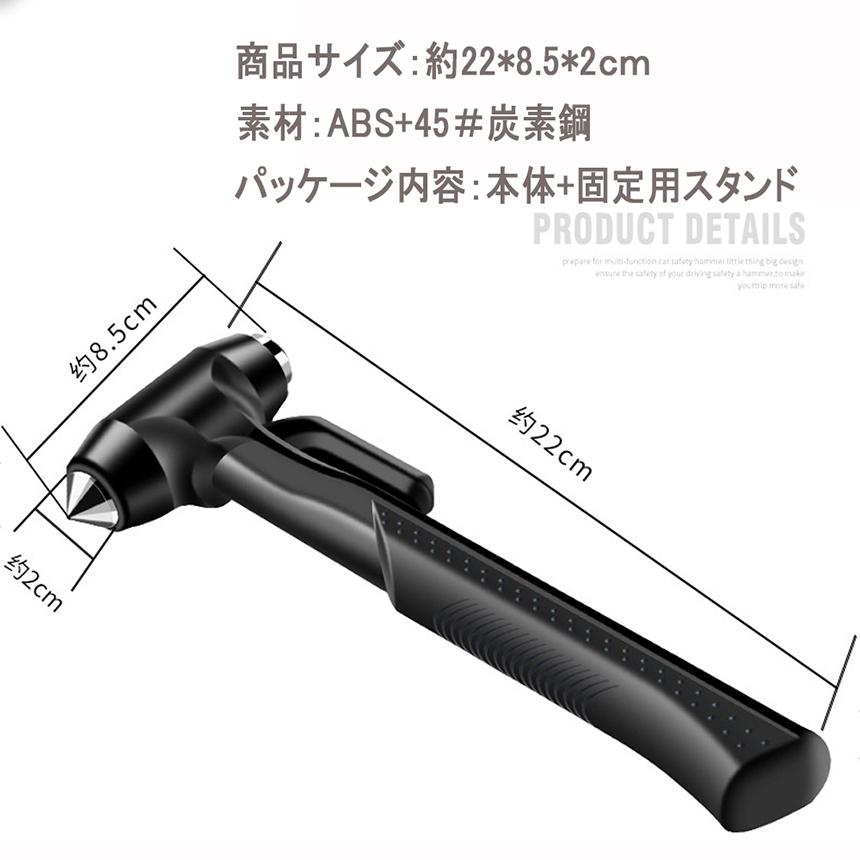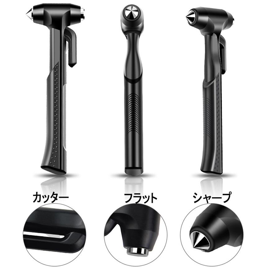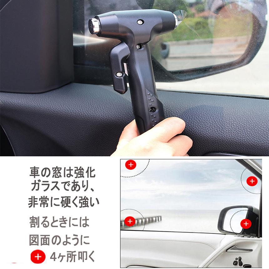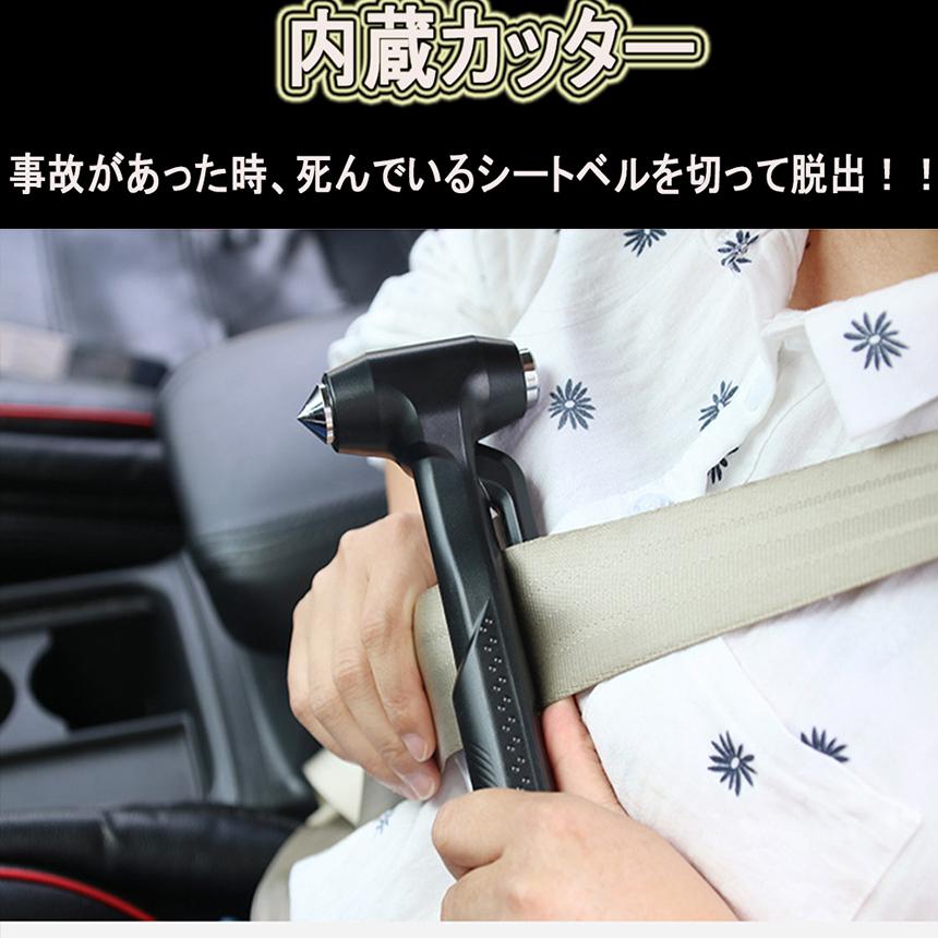 【シートベルトカッター付き】シートベルトにロックが掛かってしまい外せない場合には、ハンマーのサイドについたカッターで切断することができます。