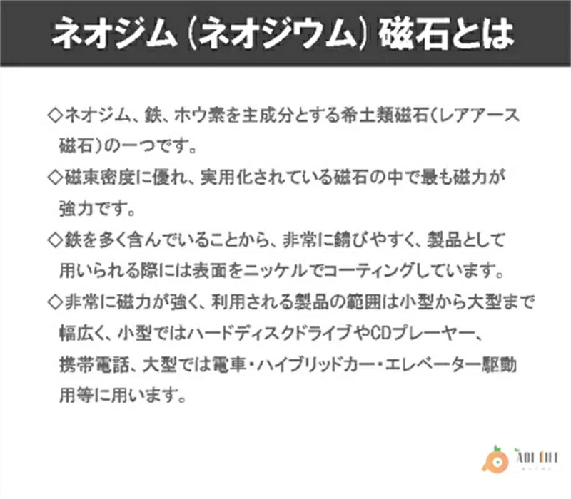 ネオジム磁石とは、ネオジム、鉄、ホウ素を主成分とする、 希土類磁石(レアアース)の1つで永久磁石ともいいます。