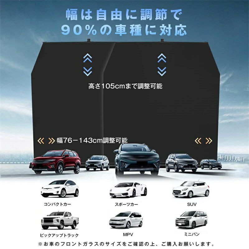 【最新式・多車種対応車用サンシェード】従来の車用サンシェードとは異なり、自由に調整できる広さ(76-143cm)と高さ(0‐105cm)を備えたこの車用サンシェードは、確実にフロントガラスをカバーし、コンパクトカー、ハッチバック、セダン、SUVなどさまざまな車種に適用できます。フロントガラスのサイズに困っている方に最適です。※曲面の大きなフロントガラスの車種には適用できない場合がありますので、ご購入前にサイズをご確認ください。