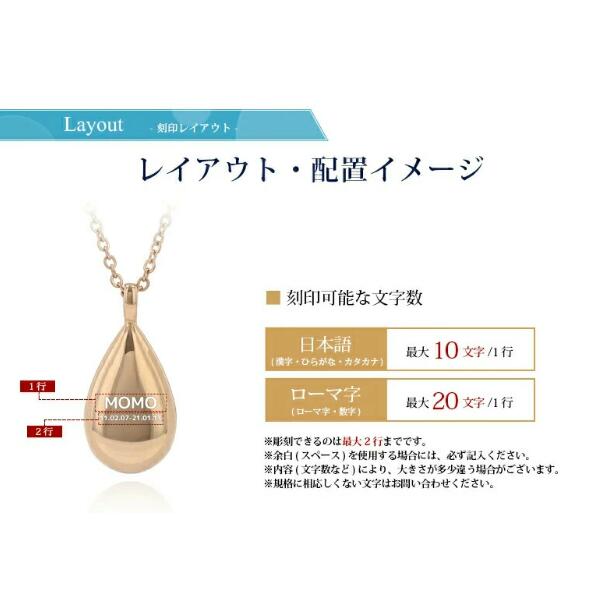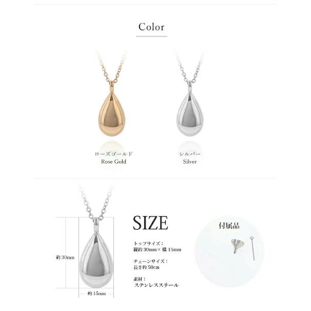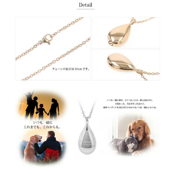 大切な家族や人との思い出をいつまでも身近に感じられる「遺骨ペンダント 」は、ウォータードロップモチーフが特徴の美しいデザインです。ステンレススチール素材を使用しており、さびにくく長くご愛用いただけます。ペンダントには名入れが可能で、特別なメッセージや名前を刻むことで、より一層の思い出を刻むことができます。ミニ骨壷としての機能も持ち、遺骨を大切に保管することができます。シンプルでありながらもエレガントなデザインは、日常のどんなシーンにも自然に溶け込みます。大切な人を永遠に感じられるこのメモリアルアクセサリーは、心の支えとなることでしょう。