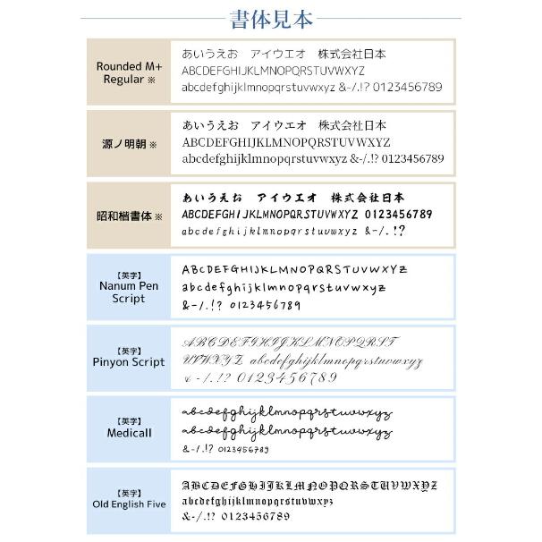 ■ローマ字のみ対応可能なフォント(Pinyon Script・Nanum Pen Script・Medicall・Old English Five)を選択し、日本語(漢字・ひらがな・カタカナ)ご記入の場合、フォント源ノ明朝で刻印いたします。