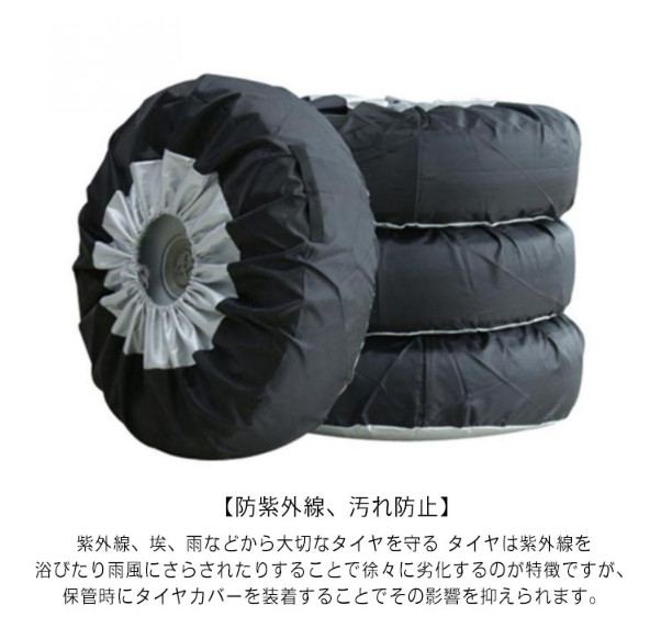 【防紫外線、汚れ防止】紫外線、埃、雨などから大切なタイヤを守る タイヤは紫外線を浴びたり雨風にさらされたりすることで徐々に劣化するのが特徴ですが、保管時にタイヤカバーを装着することでその影響を抑えられます。