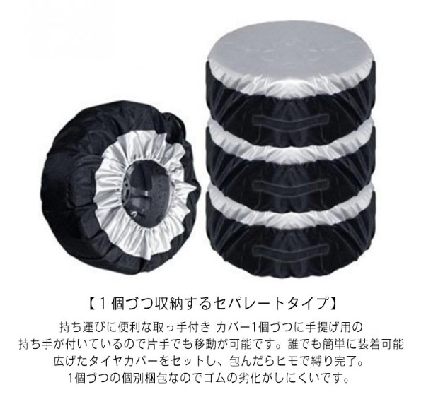 【1個づつ収納するセパレートタイプ】持ち運びに便利な取っ手付き カバー1個づつに手提げ用の持ち手が付いているので片手でも移動が可能です。誰でも簡単に装着可能 広げたタイヤカバーをセットし、包んだらヒモで縛り完了。1個づつの個別梱包なのでゴムの劣化がしにくいです。