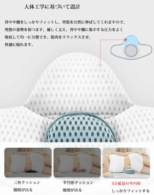 背中や腰をしっかりフィットし、背筋を自然に伸ばしてくれますので、理想の姿勢を保つます。優しく支え、背中や腰に集中する圧力をよく吸収して均一に分散でき、筋肉をリラックスさせ、快適に眠れます。