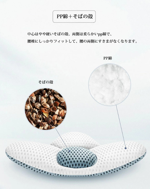 中心はやや硬いそばの殻、両側は柔らかいpp綿で、腰椎にしっかりフィットして、腰の両側にすきまがなくなります。
