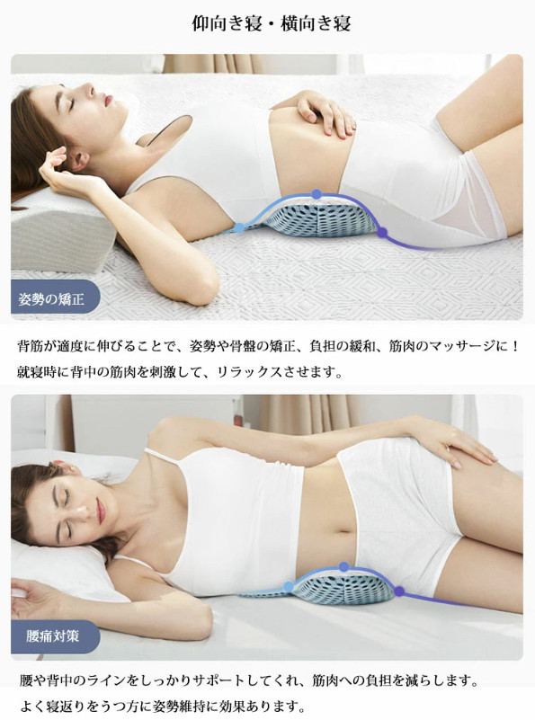 仰向き寝:背筋が適度に伸びることで、姿勢や骨盤の矯正、負担の緩和、筋肉のマッサージに!就寝時に背中の筋肉を刺激して、リラックスさせます。