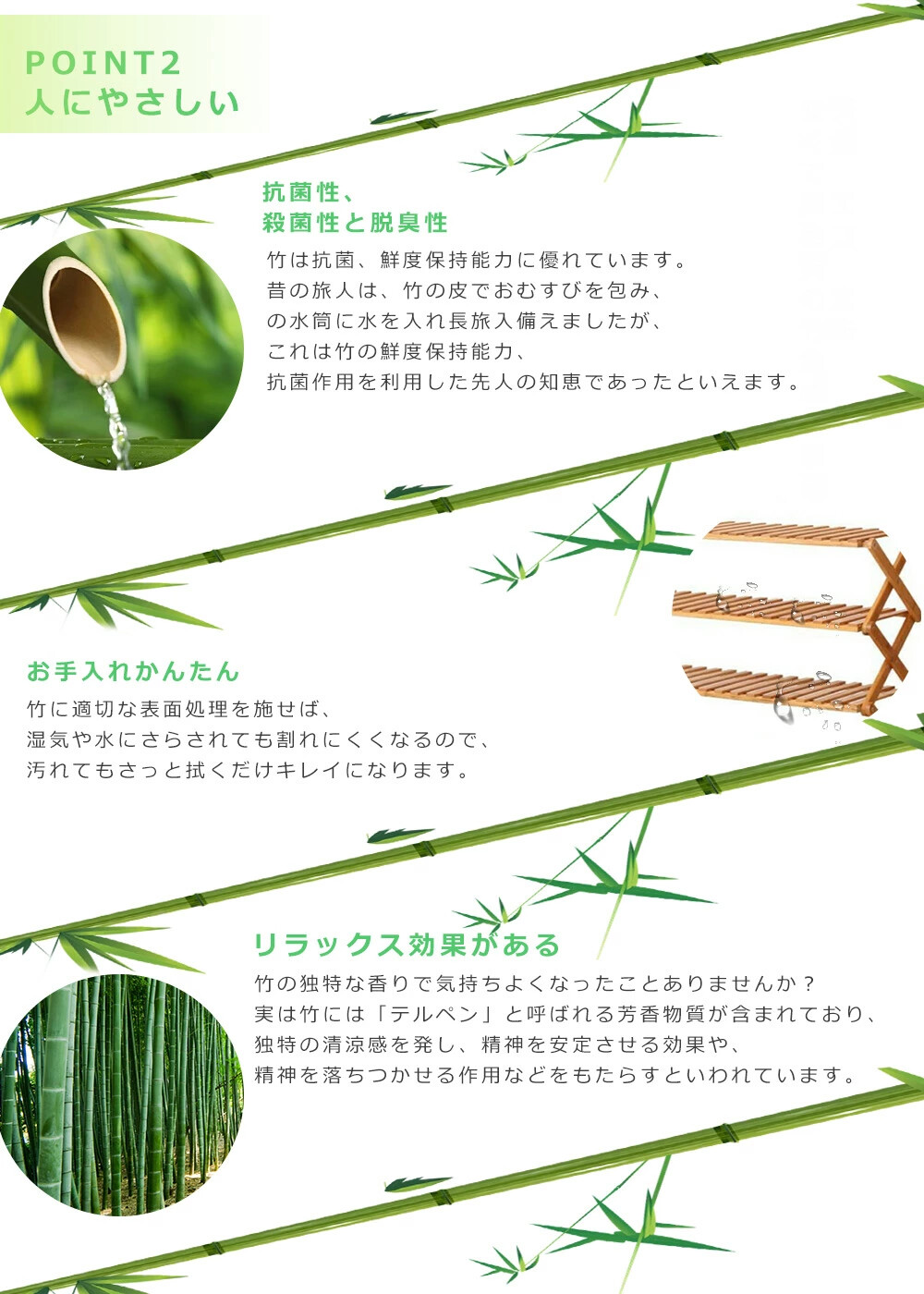 丈夫で耐久性の強い竹素材を採用しており、 竹製ならではの抗菌・消臭効果もあります。 また、折りたためばスリムにもなり軽量設計のため、