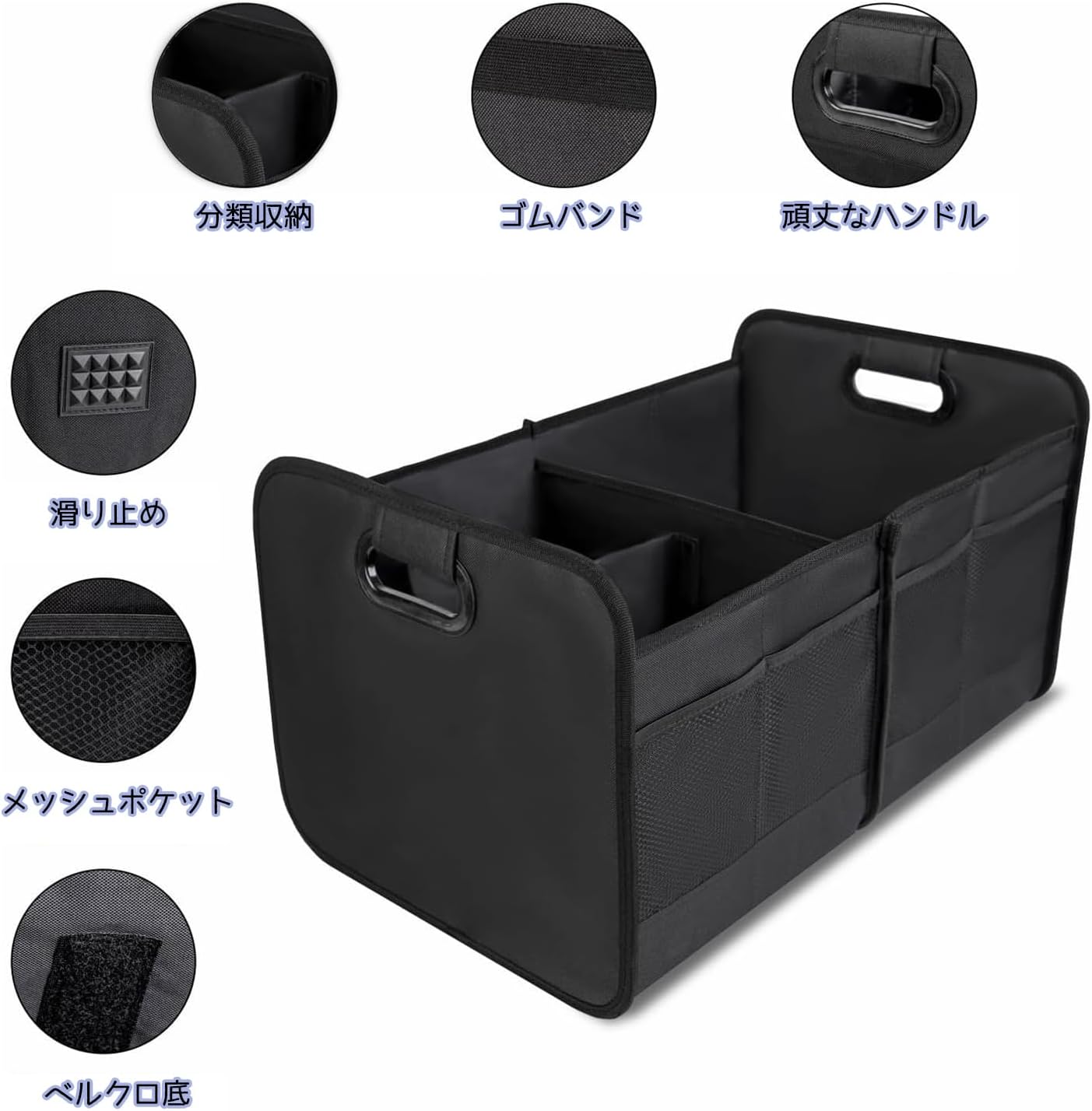 車のオーガナイザートランクには、手を守りながら移動しやすい補強持ち手が付いています。底部の滑り止めベルクロストリップは荷物をしっかり固定し、アイテムが動いたりこぼれたりするのを防ぎます。