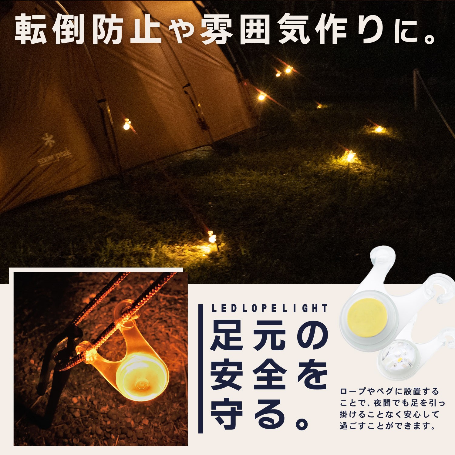 夜間の光の無い所ではテントやタープのロープが見えづらく、足を引っかけてしまいとても危険です。しかしロープライトを設置していれば、どこにロープが張られているか直ぐに確認できます!ロープのどこの位置でも設置する事が出来きるので、どなたでもご使用いただけます。灯りのない大自然の中のキャンプには必須のアイテム!