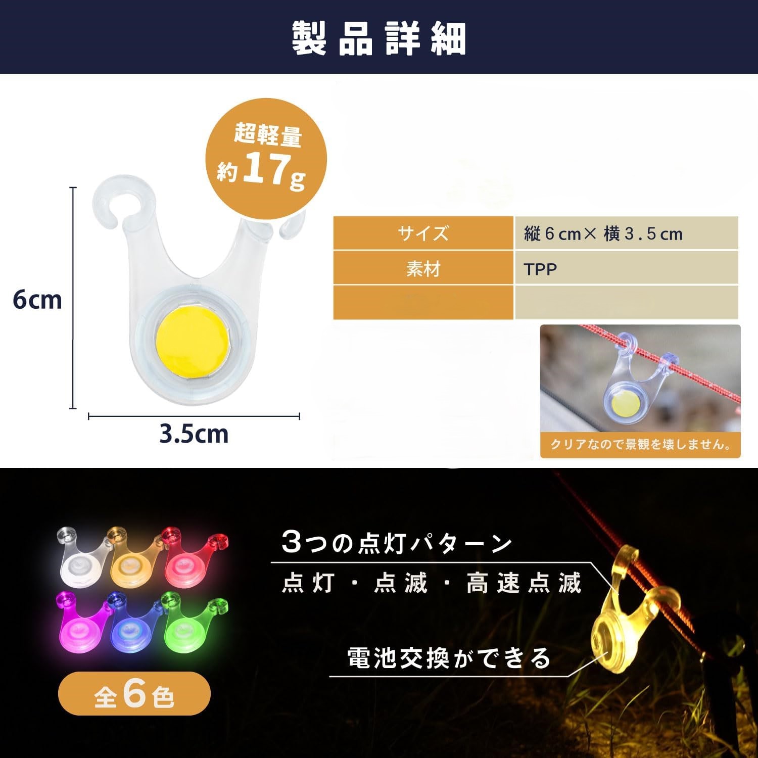 ロープ LED ライト 10個 20個セット 電池付き 電池交換出来る キャンプ アウトドア ガイロープ ペグ テント タープ 夜間 転倒 防止 防水 40時間連続点灯