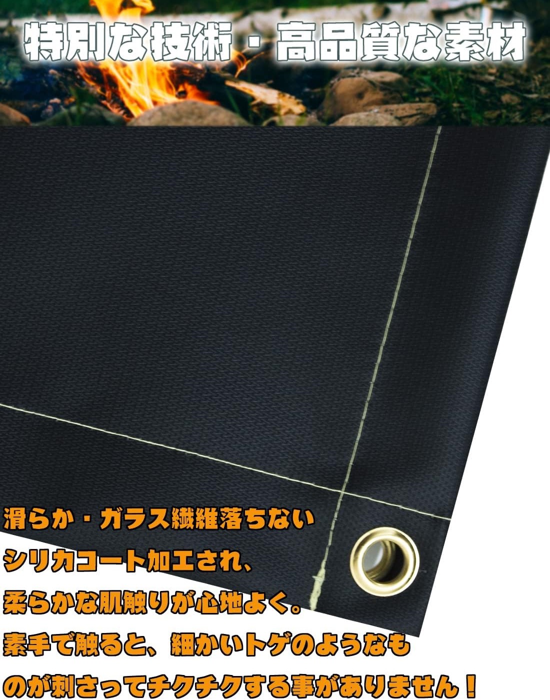 焚き火シートの両面にシリコン加工されたから、チクチクしなくて、素手で触っても大丈夫で手触りが良いです。素材 ガラス繊維サイズ 30×30cm