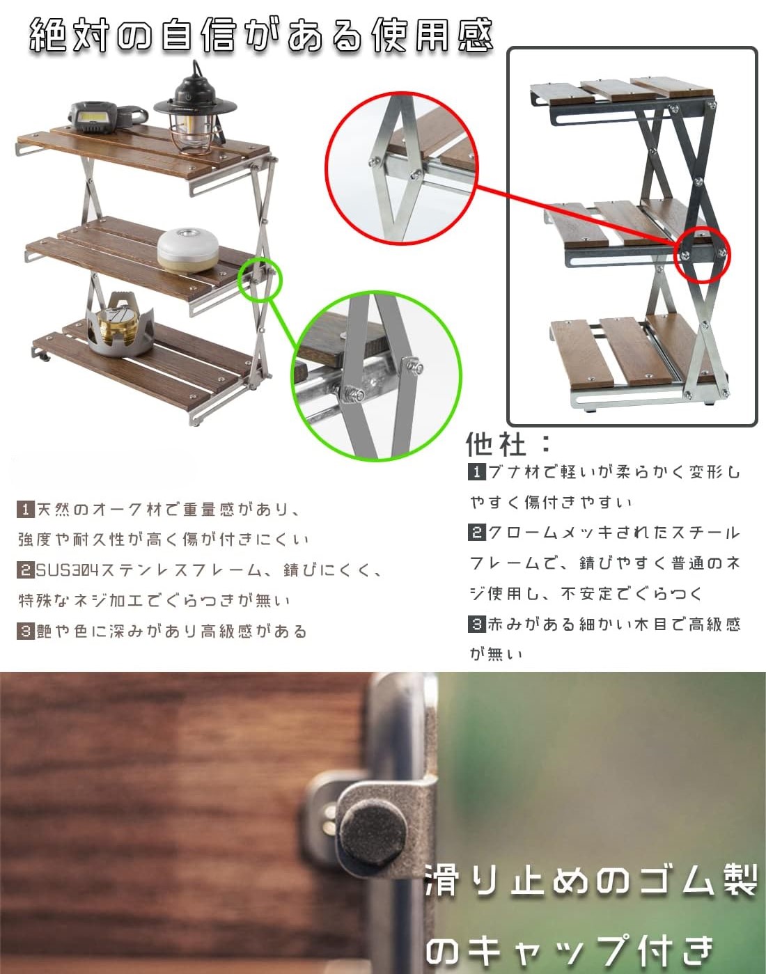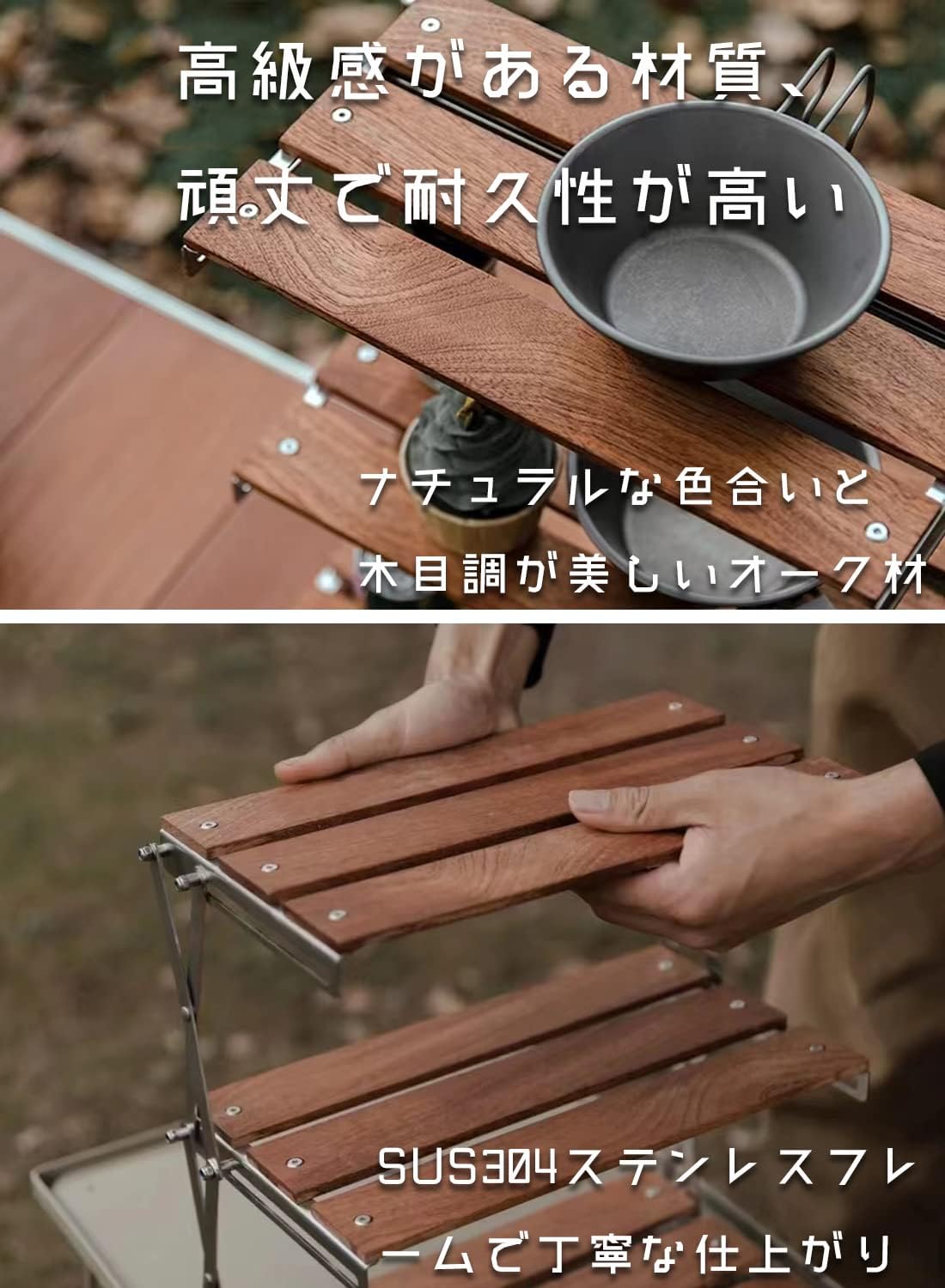 アウトドアラックの天板には天然のオーク材を使用しており、表面には腐食や汚れ防止の塗装を施してあるので掃除が簡単です。フレームには高い強度を持つSUS304ステンレスを採用しているため、頑丈で安定性が高く耐久性に優れています。