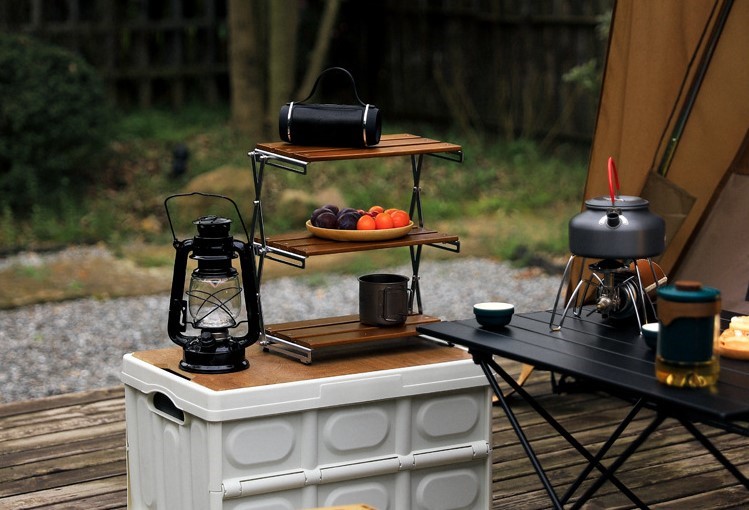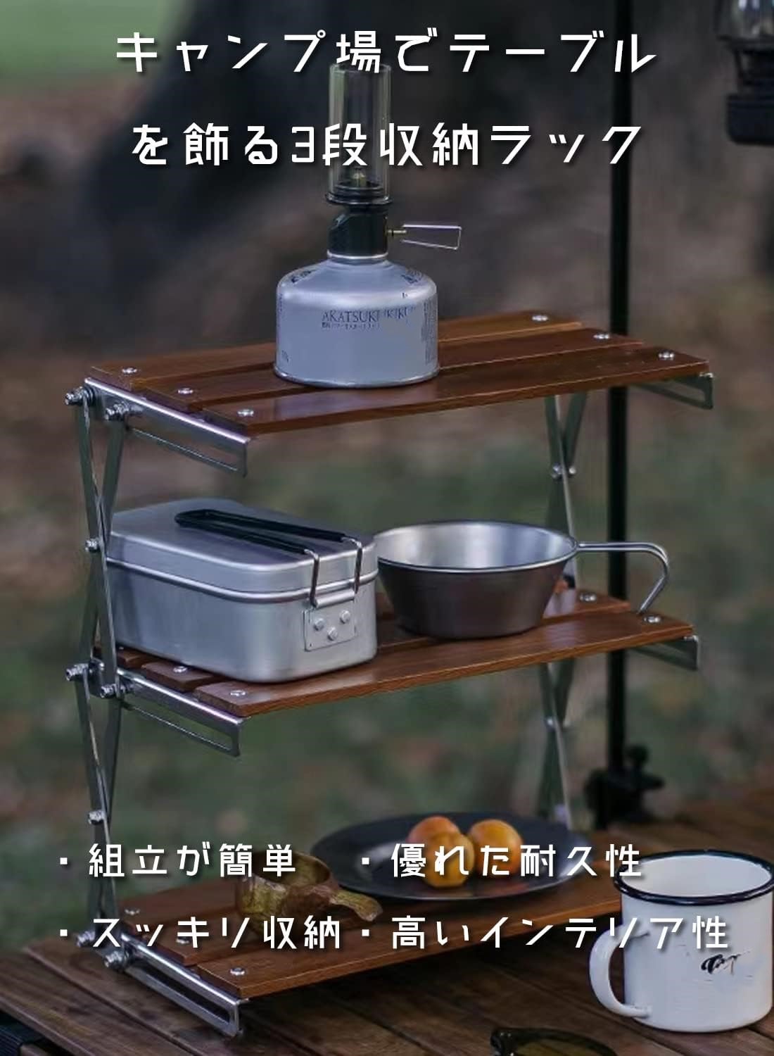 使い勝手の良い3段ラックにした事により、省スペースでも収納力が3倍に増加し、キャンプギアなどをスッキリとお洒落に整理する棚として活躍します。