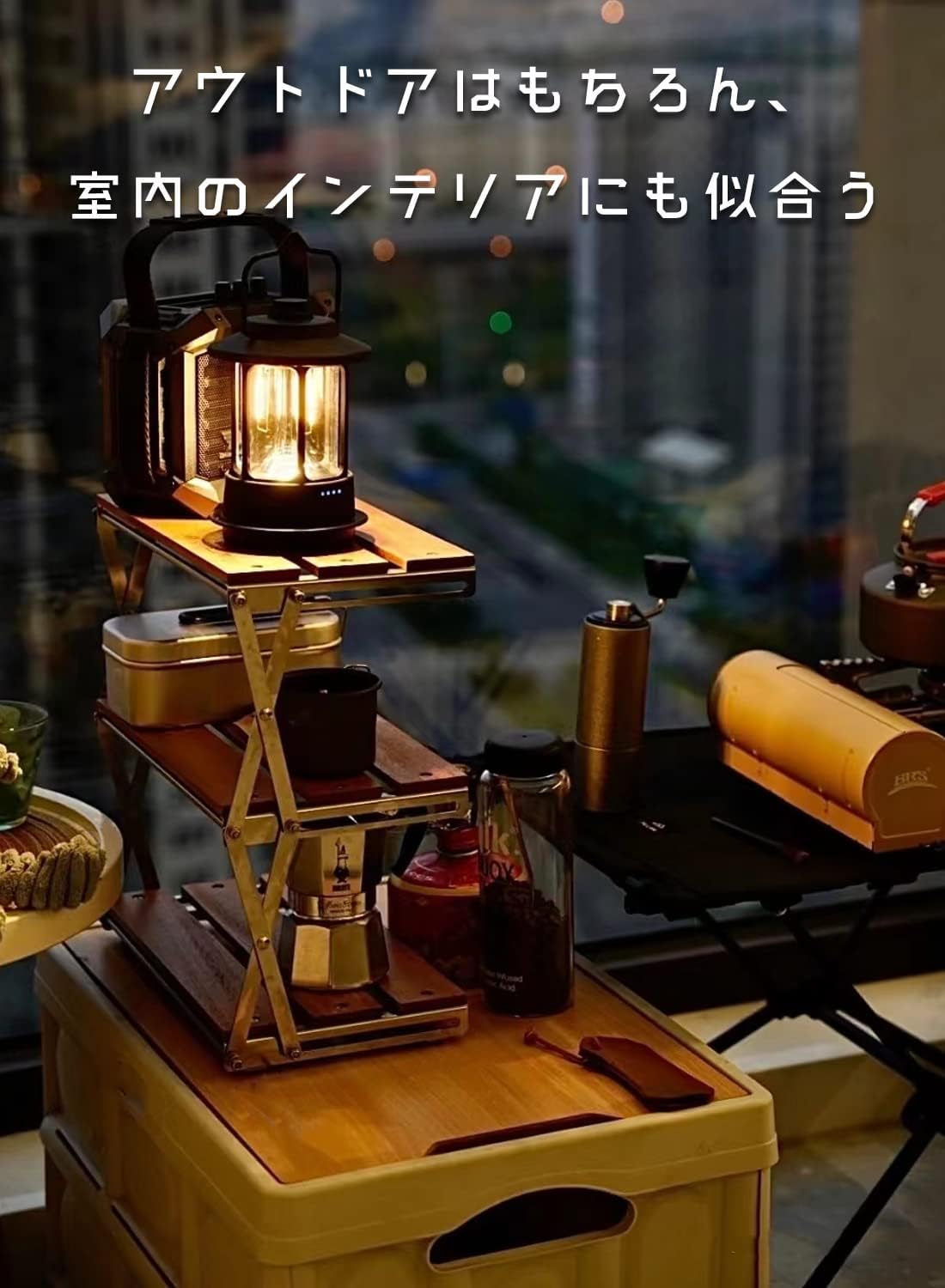 卓上ラックがアウトドアではメスティンやシェラカップ、ランタン、調味料ボックスなどの整理、家ではデスクの上のスペースを有効活用でき、生活雑貨を収納すれば、生活感を隠してスタイリッシュでお洒落な雰囲気を演出します。