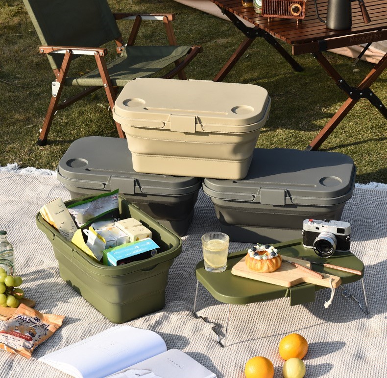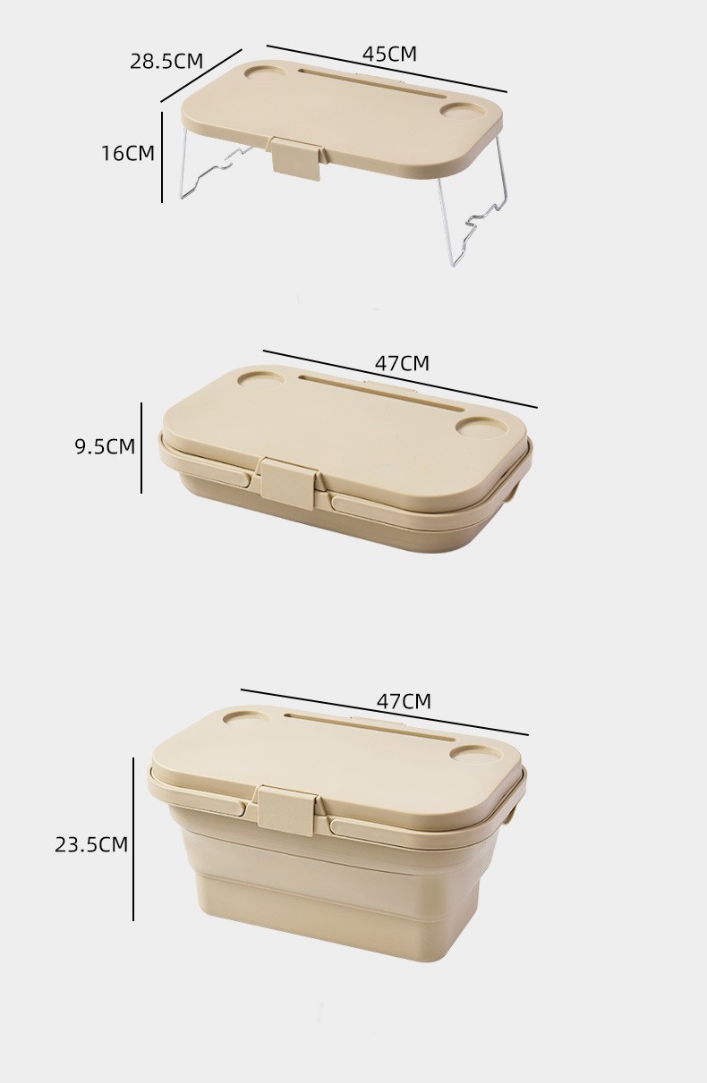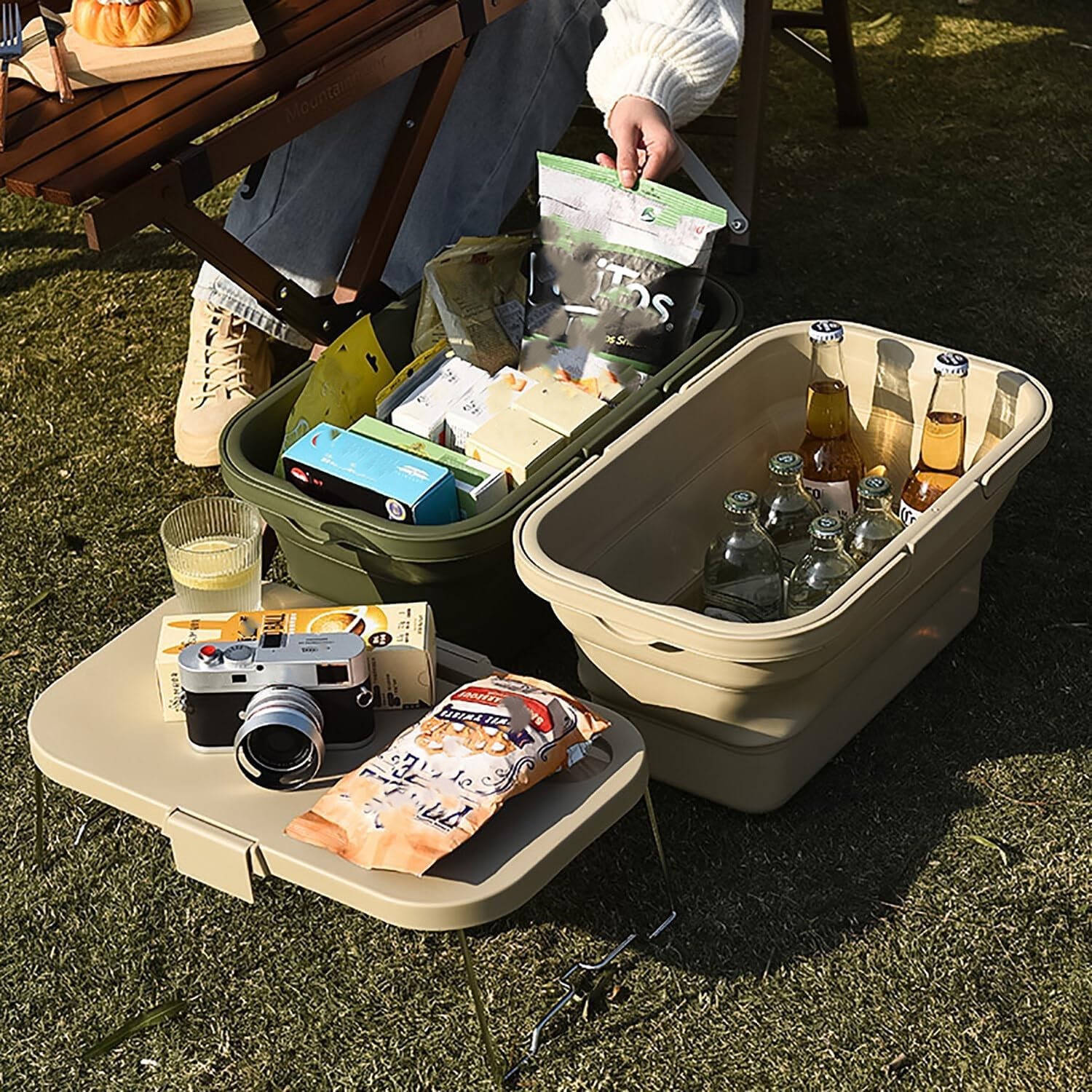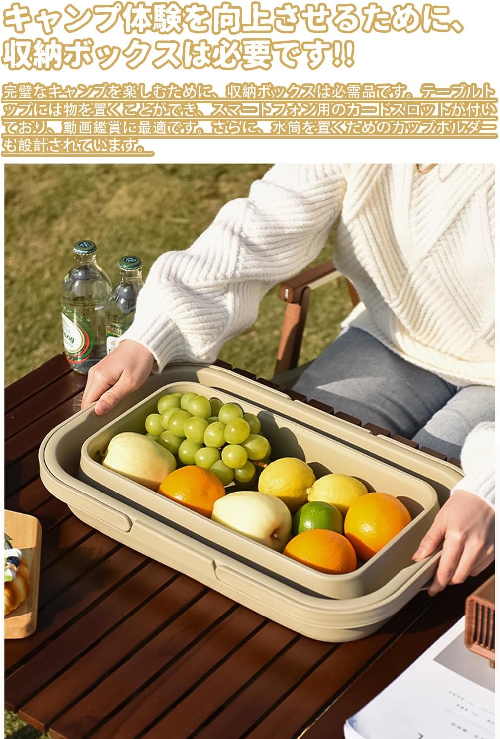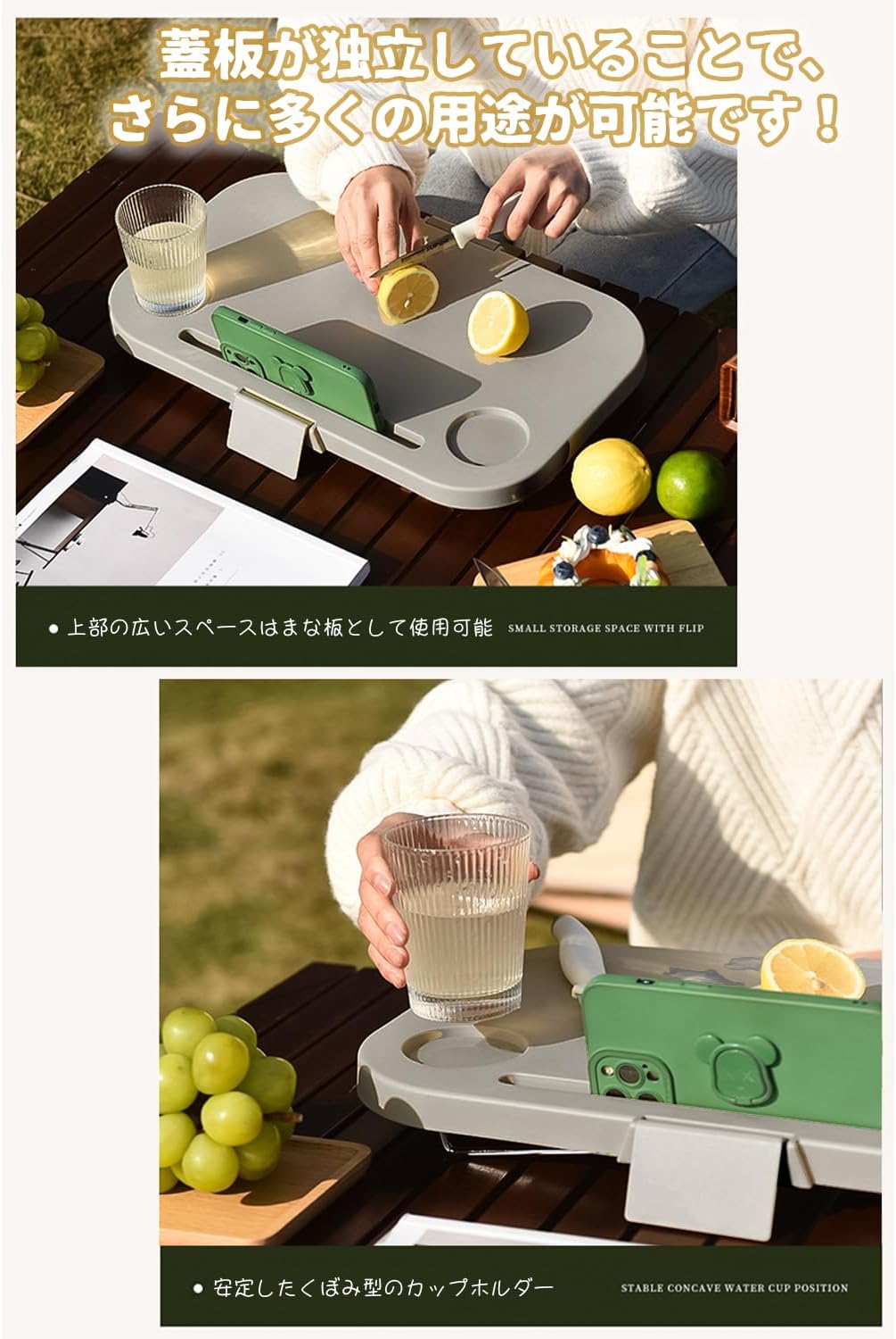 【多機能デザイン:トレーとカッティングボード】この折りたたみカゴはキャンプ用品を安全に収納するだけでなく、多機能なデザインを備えています。蓋を開けると、食事用の小さなトレーに変身したり、丈夫なカッティングボードとして使用することができます。蓋には2つのカップホルダーとスマートフォンスロットも装備されています。
