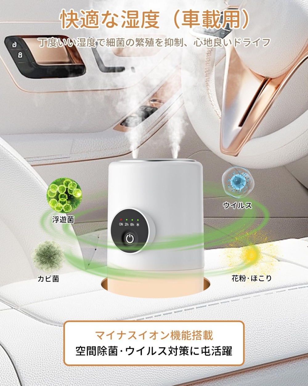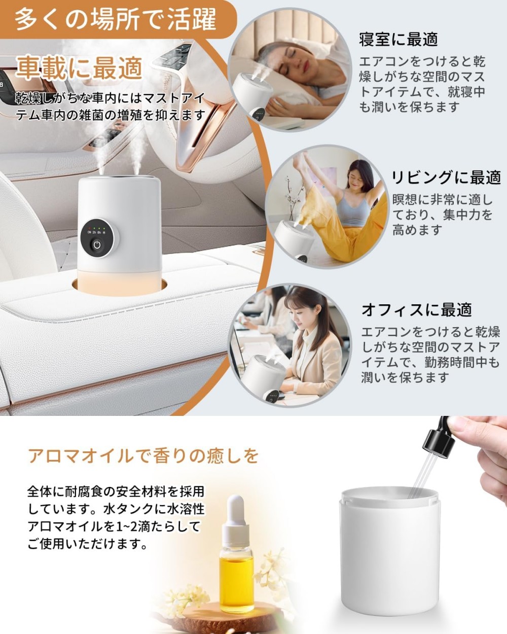 【用途が広範囲】加湿器の用途は非常に広範囲です。自動車、寝室、オフィス、寮、リビング、書斎、子供部屋、老人部屋などに応用でき、いずれの場所でも重要な役割を果たします。また、加湿器は花粉、鼻、のど、肌の乾燥を防ぎ、静電気も防止します!花粉が舞う季節には、アレルギー症状を軽減し、呼吸をよりスムーズにします。乾燥しやすい鼻やのどに対して、加湿器は湿りを保ち、不快感を減らします。(※、芳香はサポートしていません。純粋な加湿体験に専念させ、香りによる不快感やアレルギー反応を避けます。)