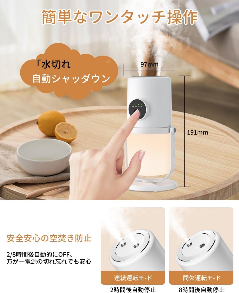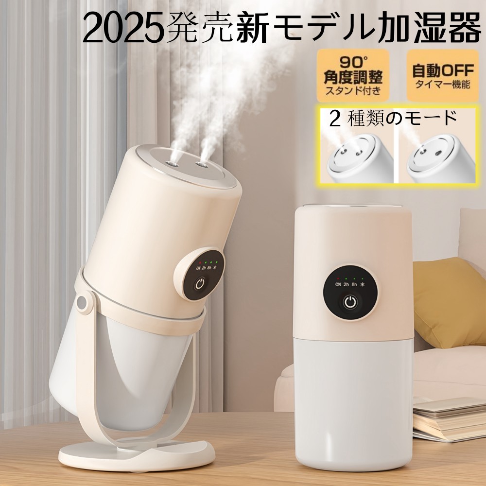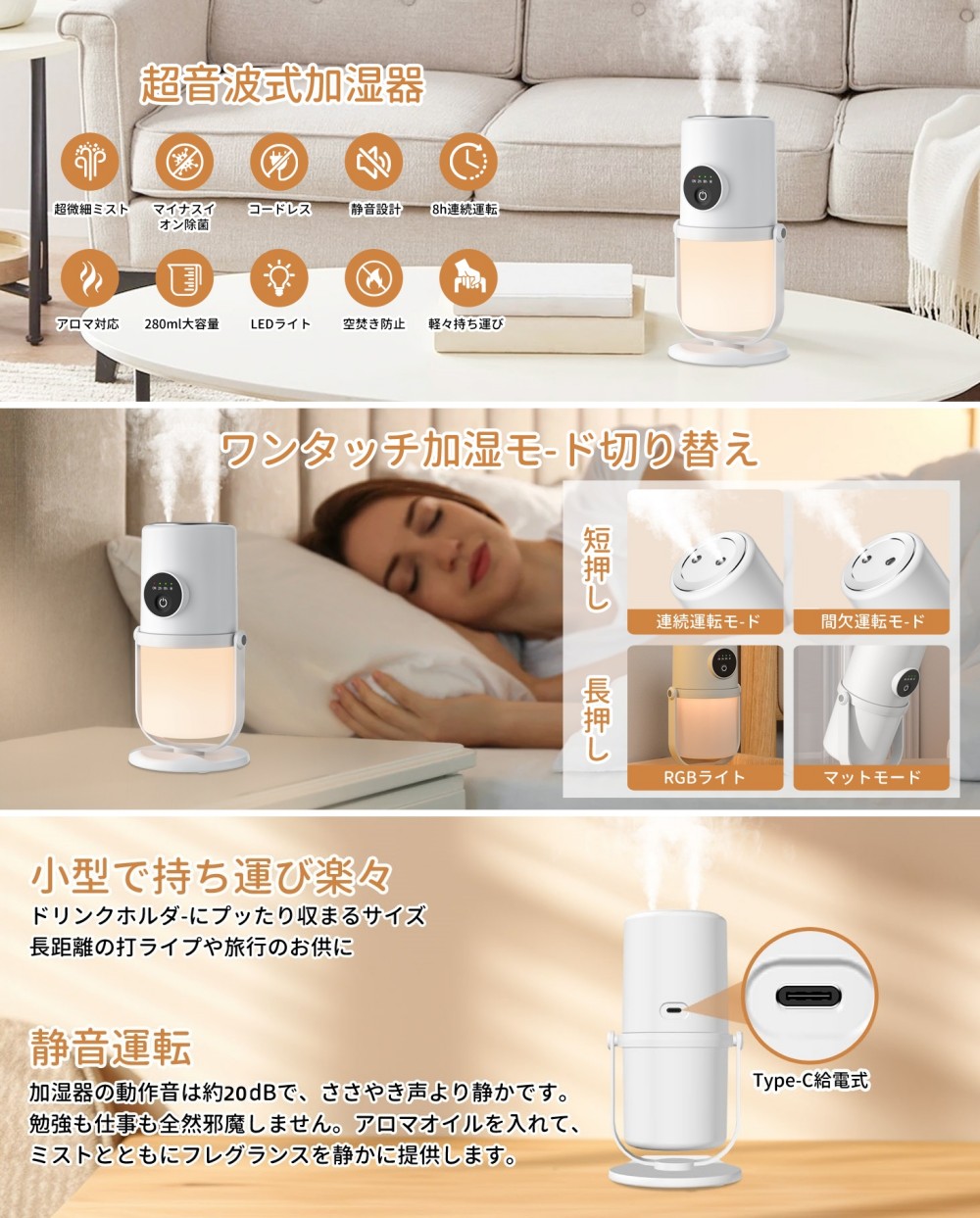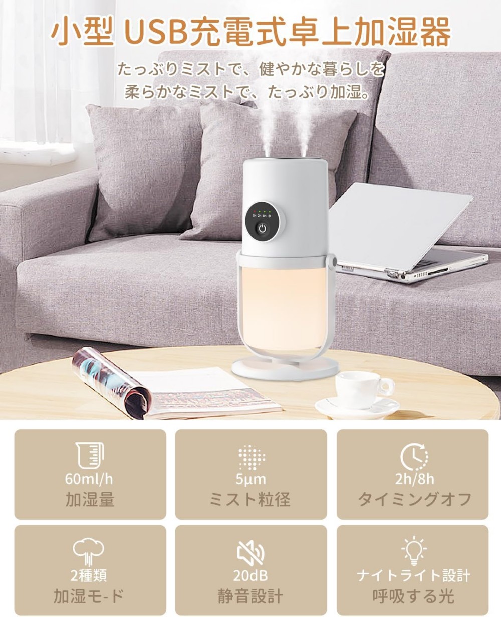 卓上加湿器 コードレス 超音波式 加湿器 小型 卓上 ダブル噴霧 280ml 空焚き防止 タイマー スタンド付 90°角調整 ライト付 静音節電 USB 充電式 持ち運び便利