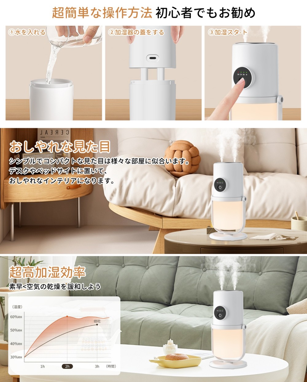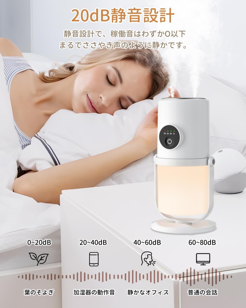 【超静音設計& ナイトライト付き】運転騒音≦20dB!図書館よりも静かで、周囲の湿度を保ちながら仕事や睡眠の妨げにならないデスク加湿器が理想です。忙しい勤務時間でも、静かな夜でも、快適で静かな環境を作ることができます。加湿器は夜間照明としても使用でき、照明もスイッチも可能で、リビング、寝室、書斎、車内などさまざまな場所に適しています